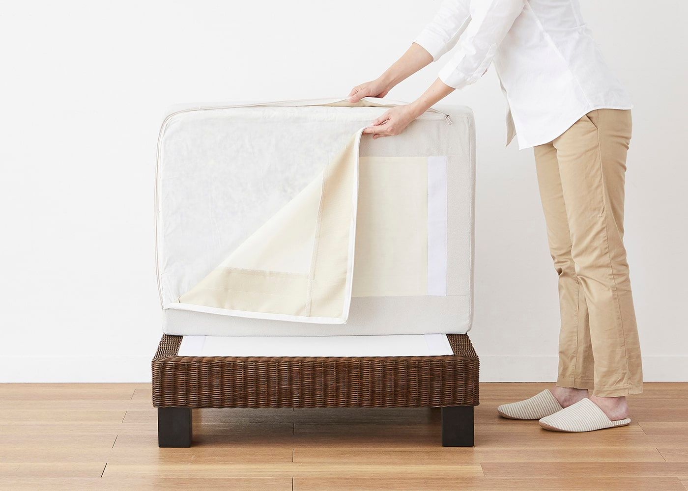 付属カバーは、わずかに起毛した上品で柔らかな風合いのポリエステル100%のファブリックです。シワになり難く摩擦に強いのも特長で、表面に撥水加工もついた機能性に優れたカバーです。