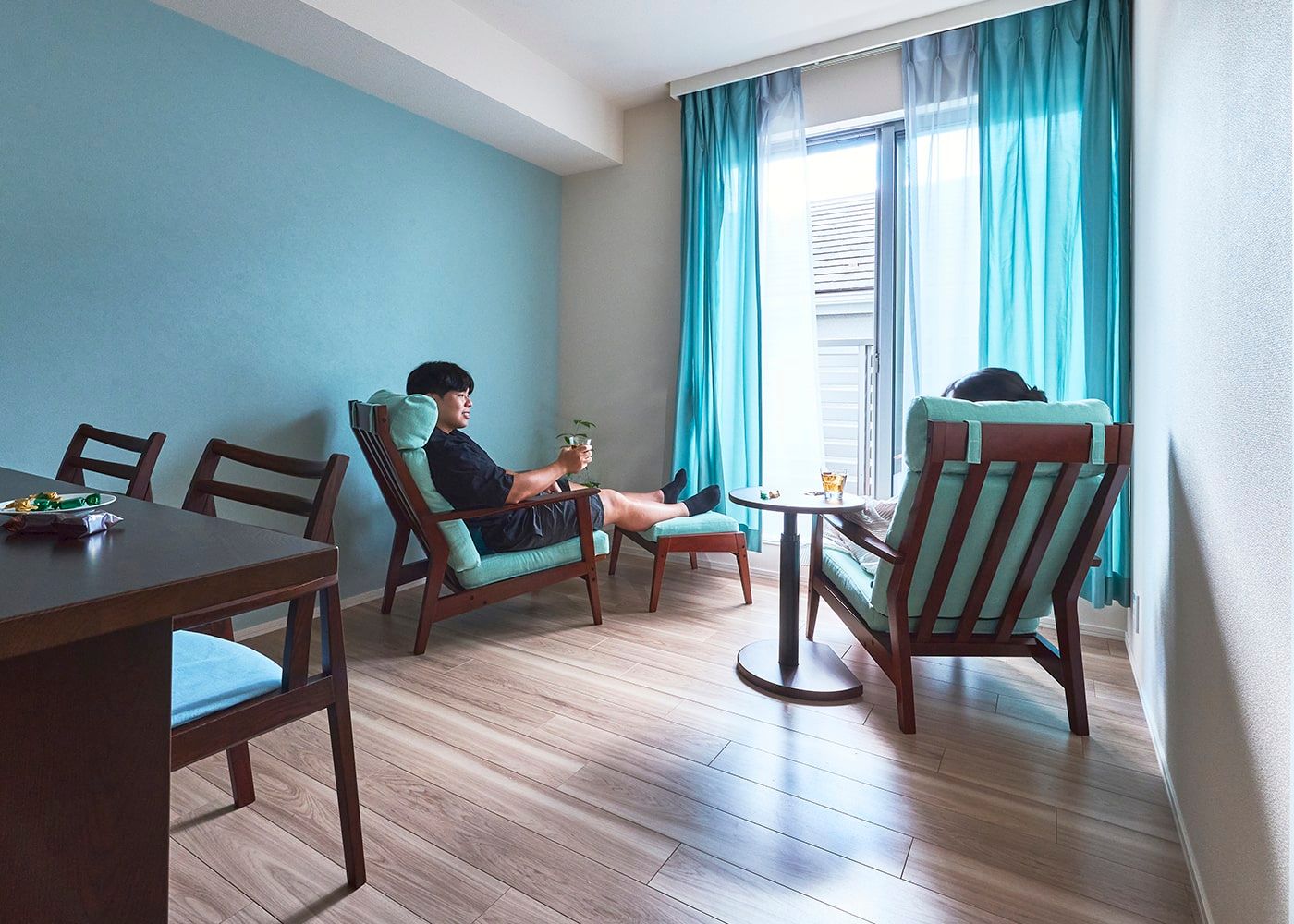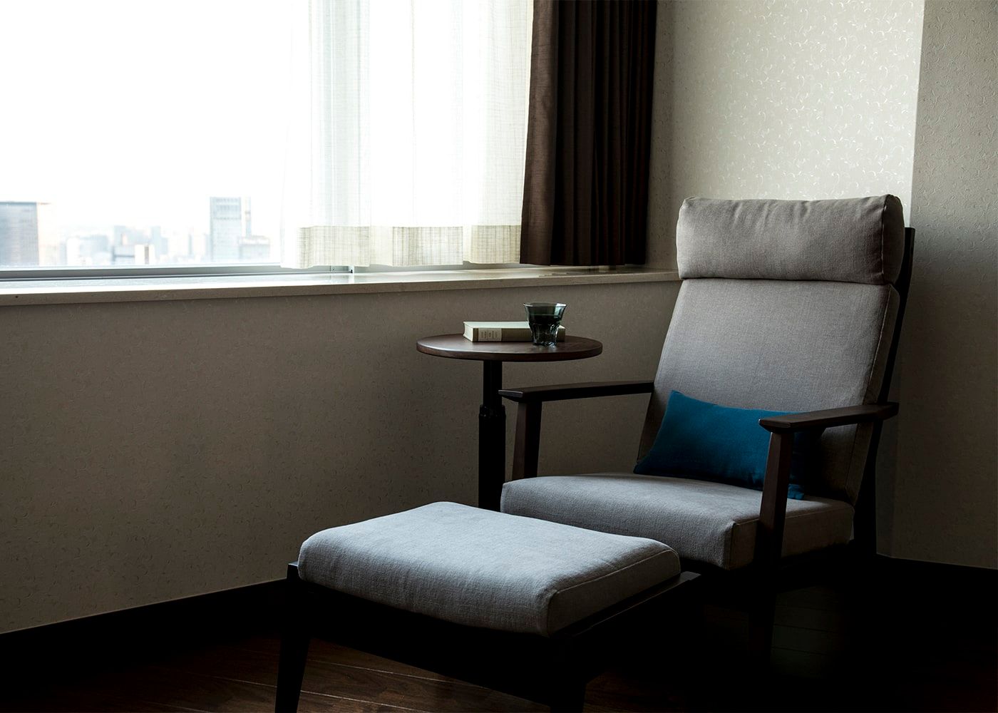 寝室の一角にラウンジチェア&オットマンを配置し、リラックスできるスペースを演出。夜には夜景を楽しみながら、一日の疲れをゆっくり癒すことができます。淡いグレーの落ち着いたブルーのアクセントがポイントです。