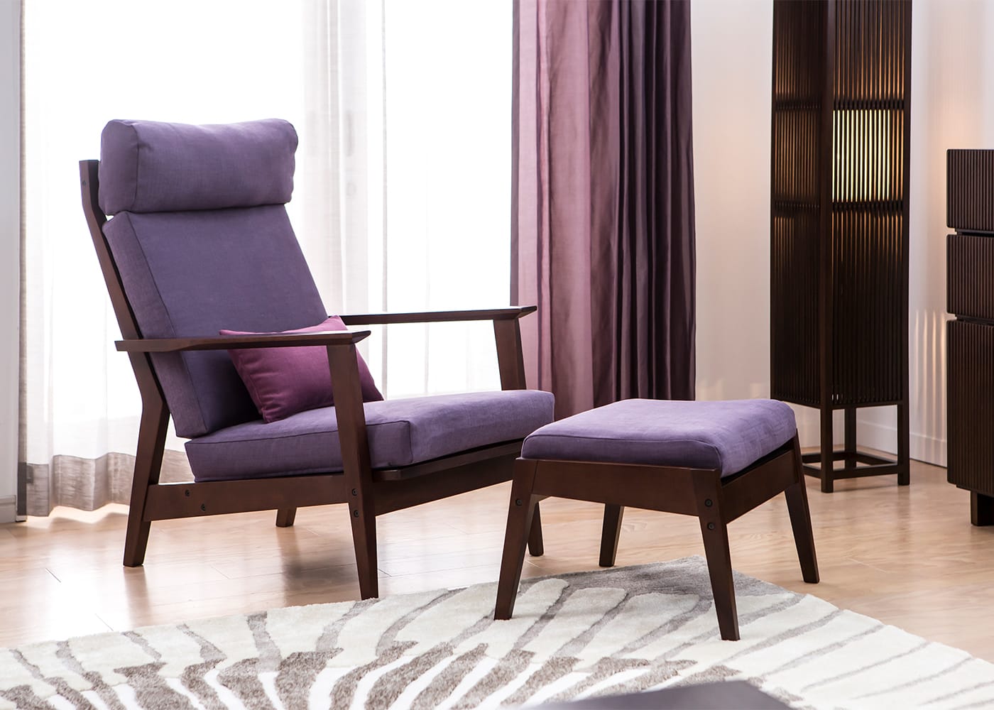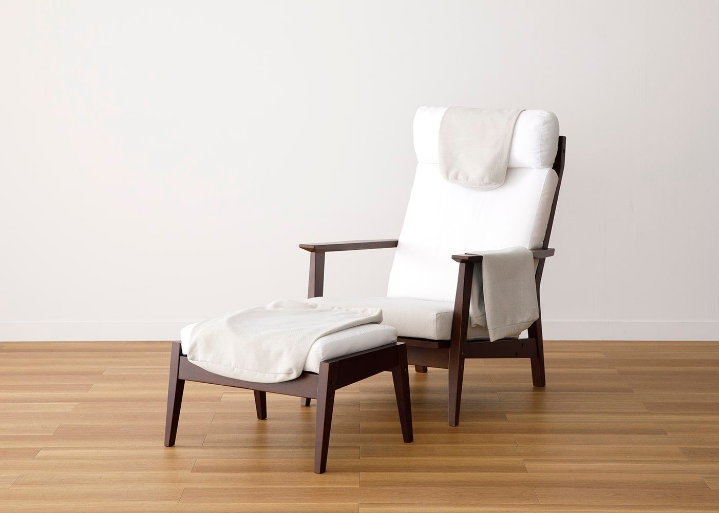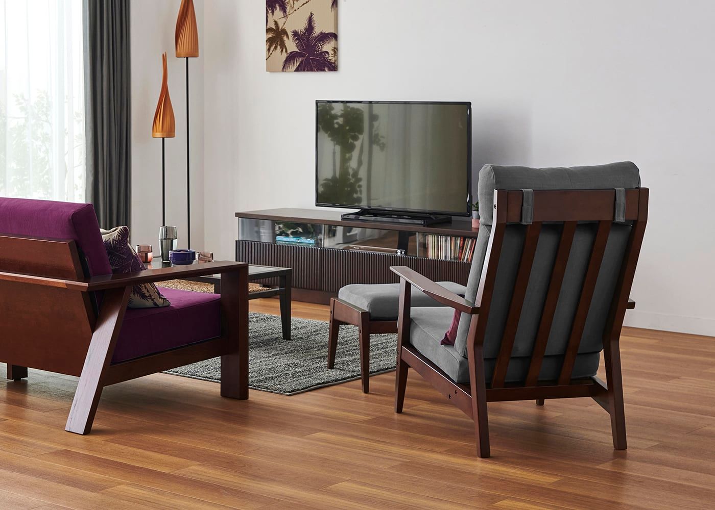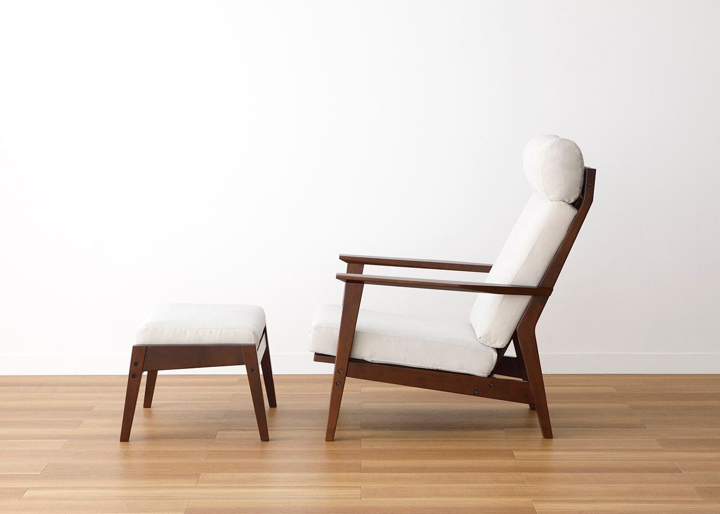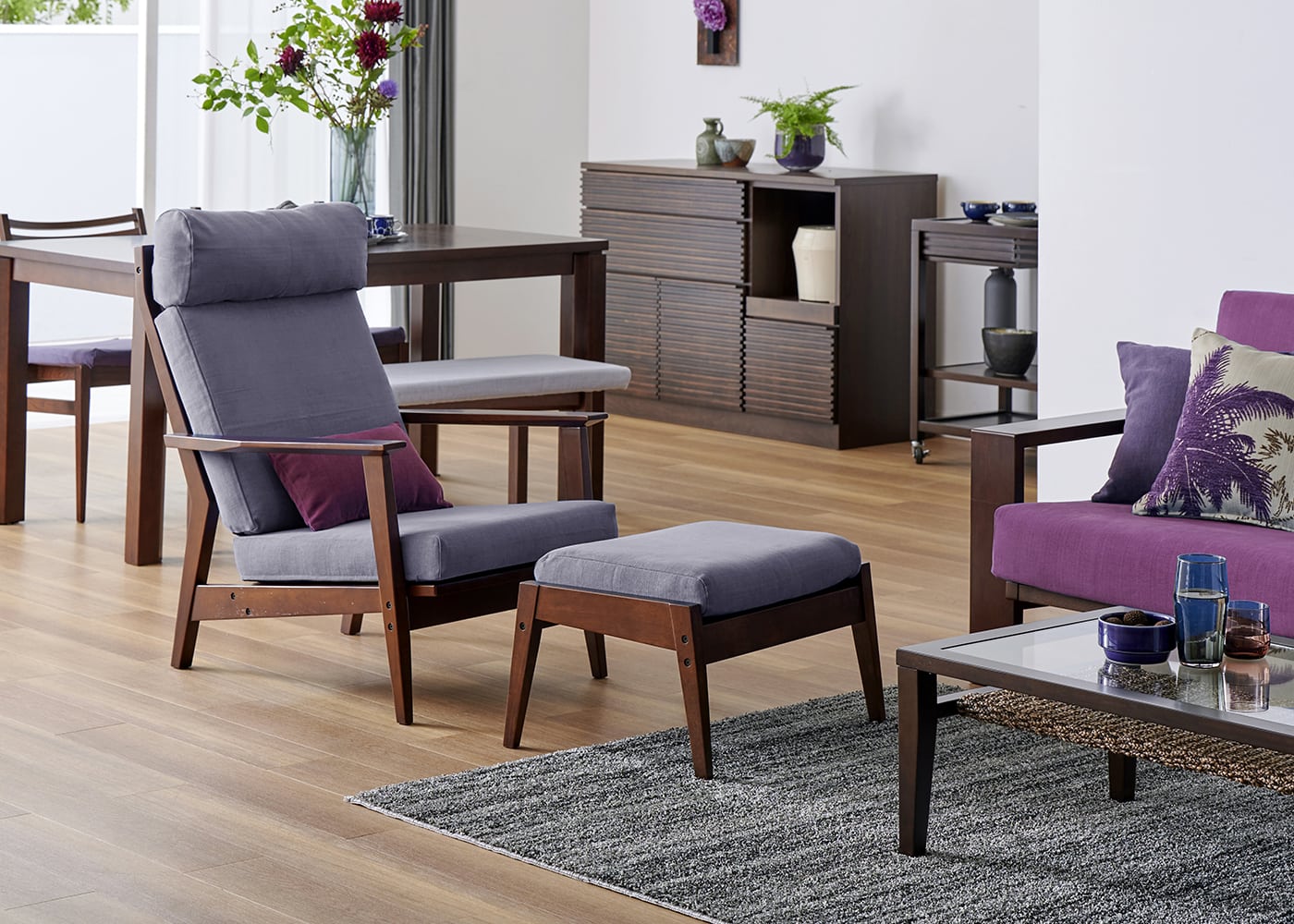 ウッド・ラウンジチェアとオットマンを一緒にレイアウトすれば、更に安楽性のあるラウンジスペースを作れます。ゆったりとテレビや映画を楽しんだり、長時間リビングで寛ぎたい時は組み合わせて使ってみましょう。(写真のチェアカバーは