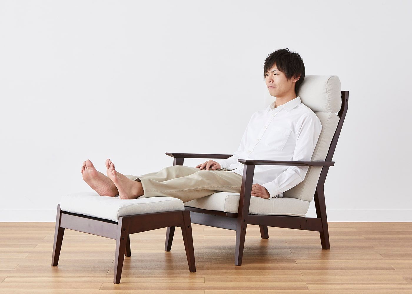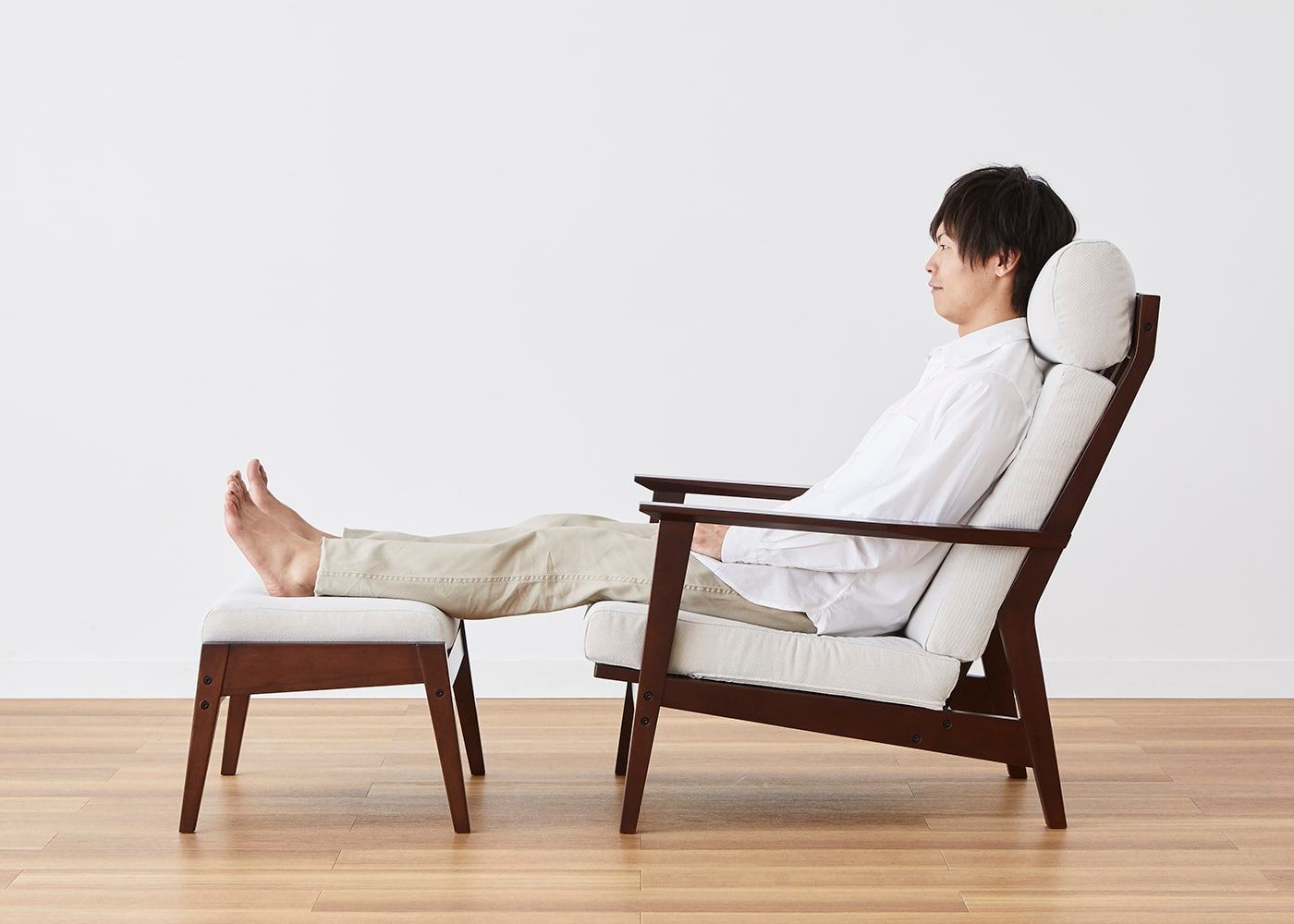 座る人の身長に合わせてオットマンの位置を変えられるのが魅力です。自分にあった座り心地を見つけてみては。(モデルは身長172cmの男性)