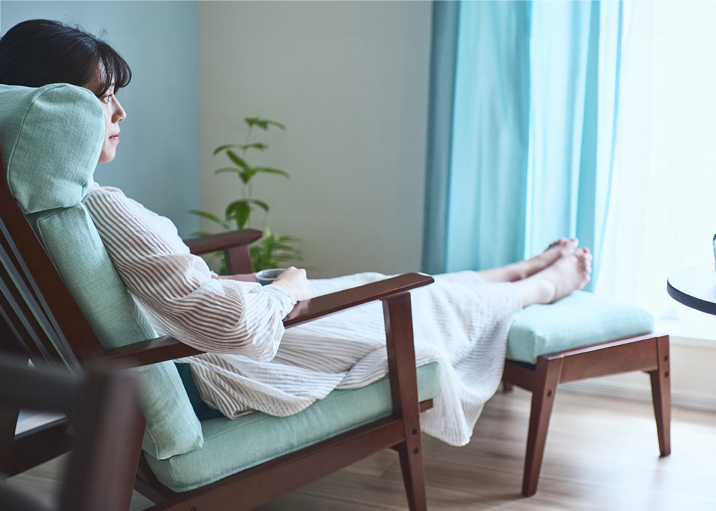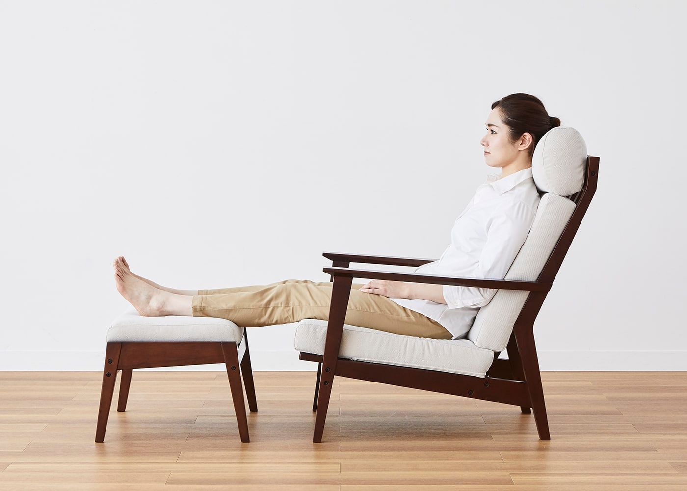 ヘッドレストから背もたれ、オットマンが頭から足先までを支えてくれます。長時間座っていても快適な、全身の体圧を分散してくれる極上のラウンジチェアセット。よりリラックスした姿勢でテレビやDVD鑑賞を楽しんでみては。(モデルは身長167cmの女性)