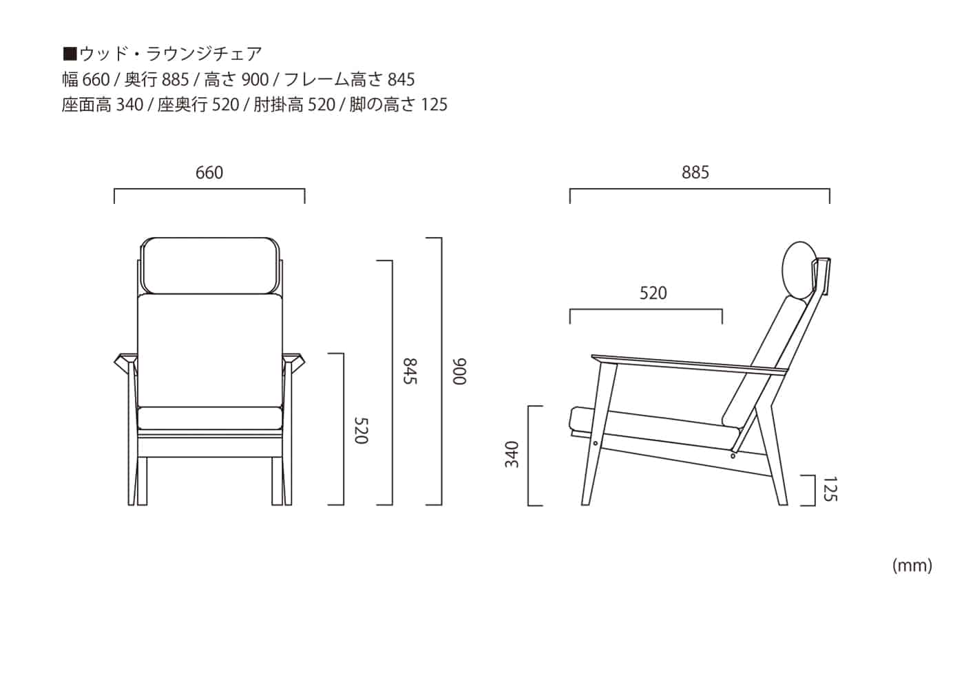 幅660 / 奥行885 / 高さ900 / 座面高340 / 座面厚80 / 座面奥行520 / 肘掛高520 ※単位はmm