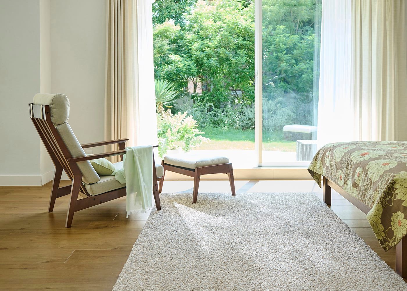 寝室の空間に余裕がある時はラウンジチェアを置くのもおすすめです。リビング以外にもプライベートスペースを作ることで、気分を変えてオフの時間を過ごすことができます。ゆったり足を伸ばせるオットマンを添えて、優しいグリーンの寝室で寛いでみましょう。