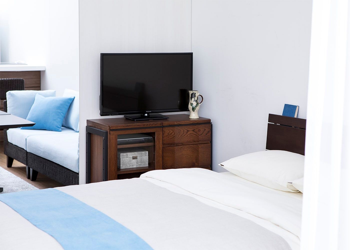 840タイプを寝室用のテレビボードとして配置したコーディネート例。お休み前にもテレビやネットで動画を楽しまれる方には最適なレイアウトです。片側がガラス扉のため、コンパクトなDVDデッキも配置できます。※背面にコード穴を付けたい時は別途お問い合わせください。