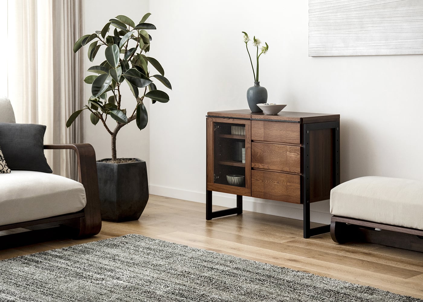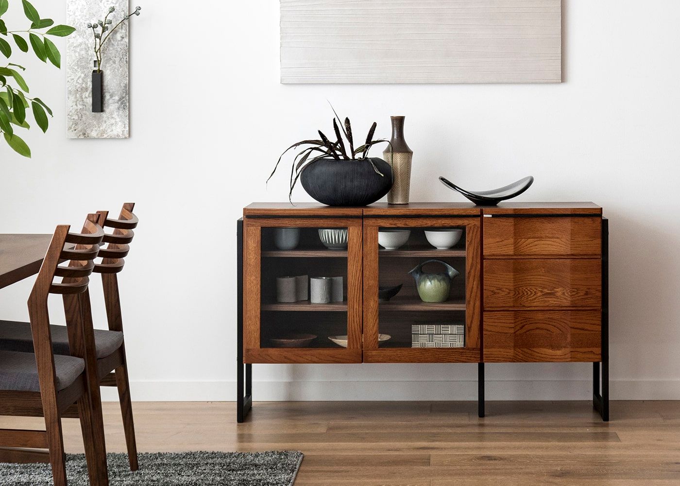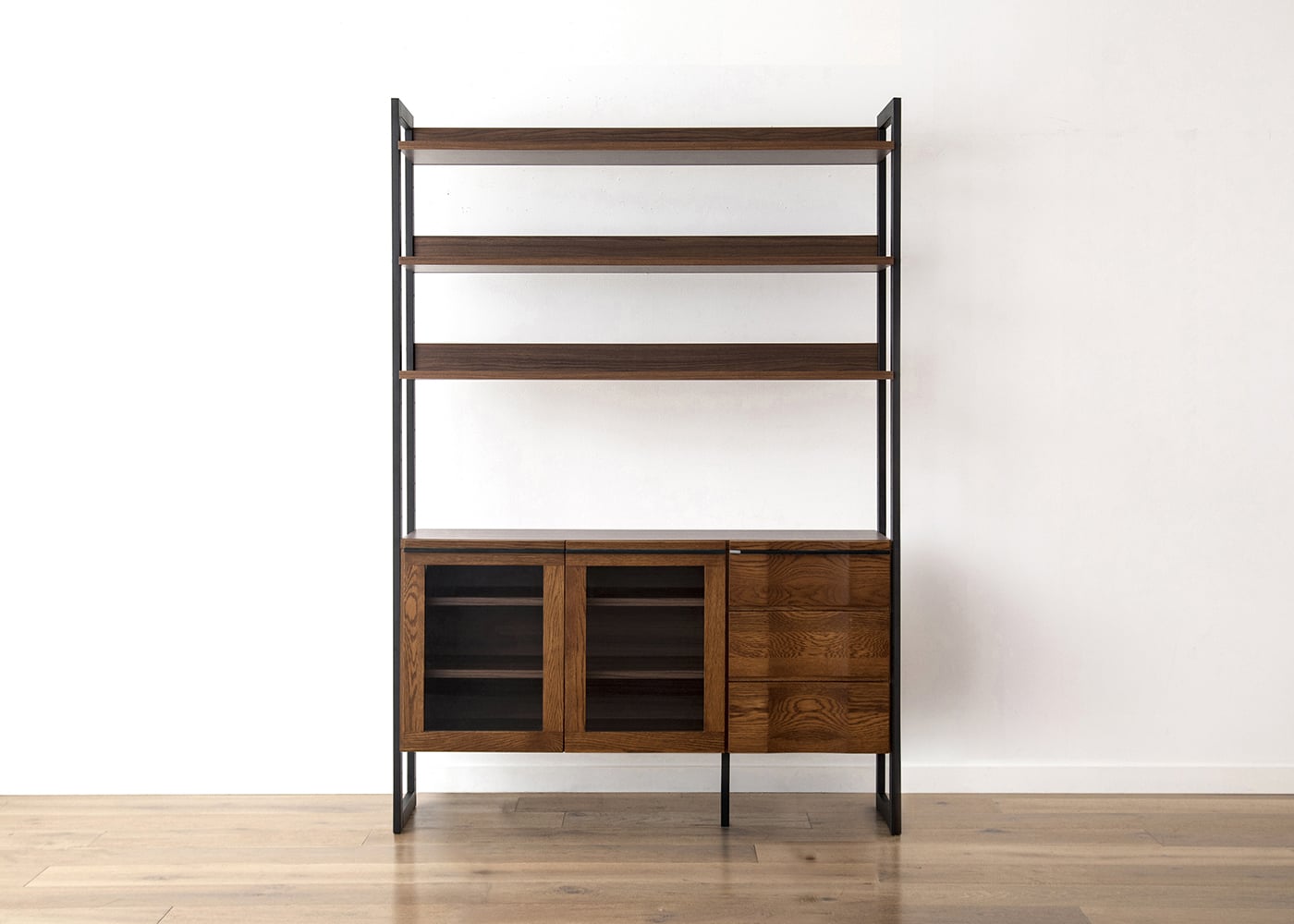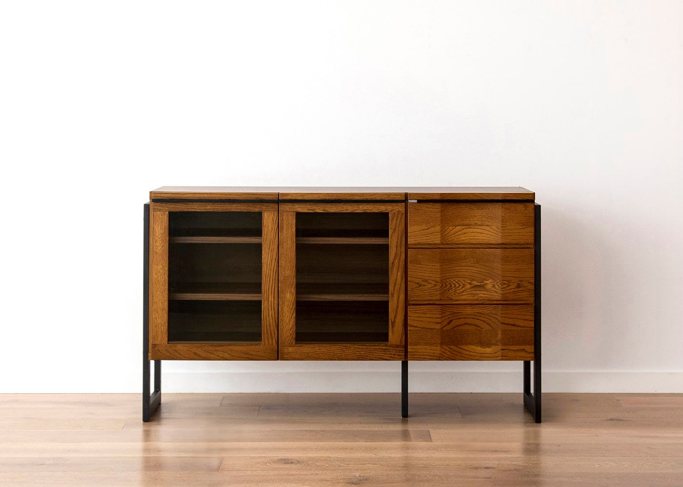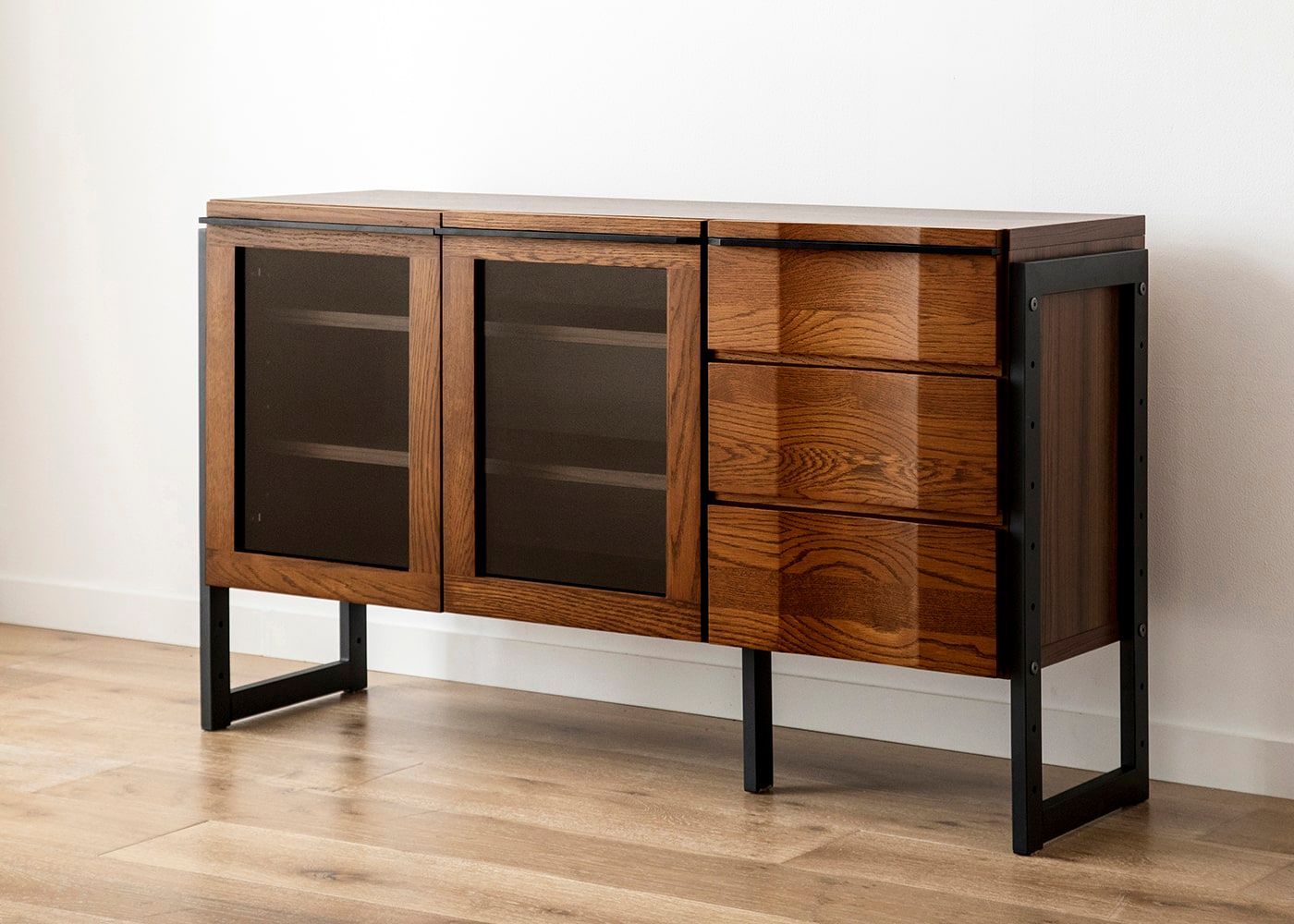 木々の生命力を感じる無垢材と落ち着きのあるアイアン素材の魅力が調和した、ハーモ・リビングボード・ガラス。ダイナミックな木目が見る人を魅了します。オーク無垢材の重厚感とお部屋を広く見せる抜け感が共存したリビングボードです。