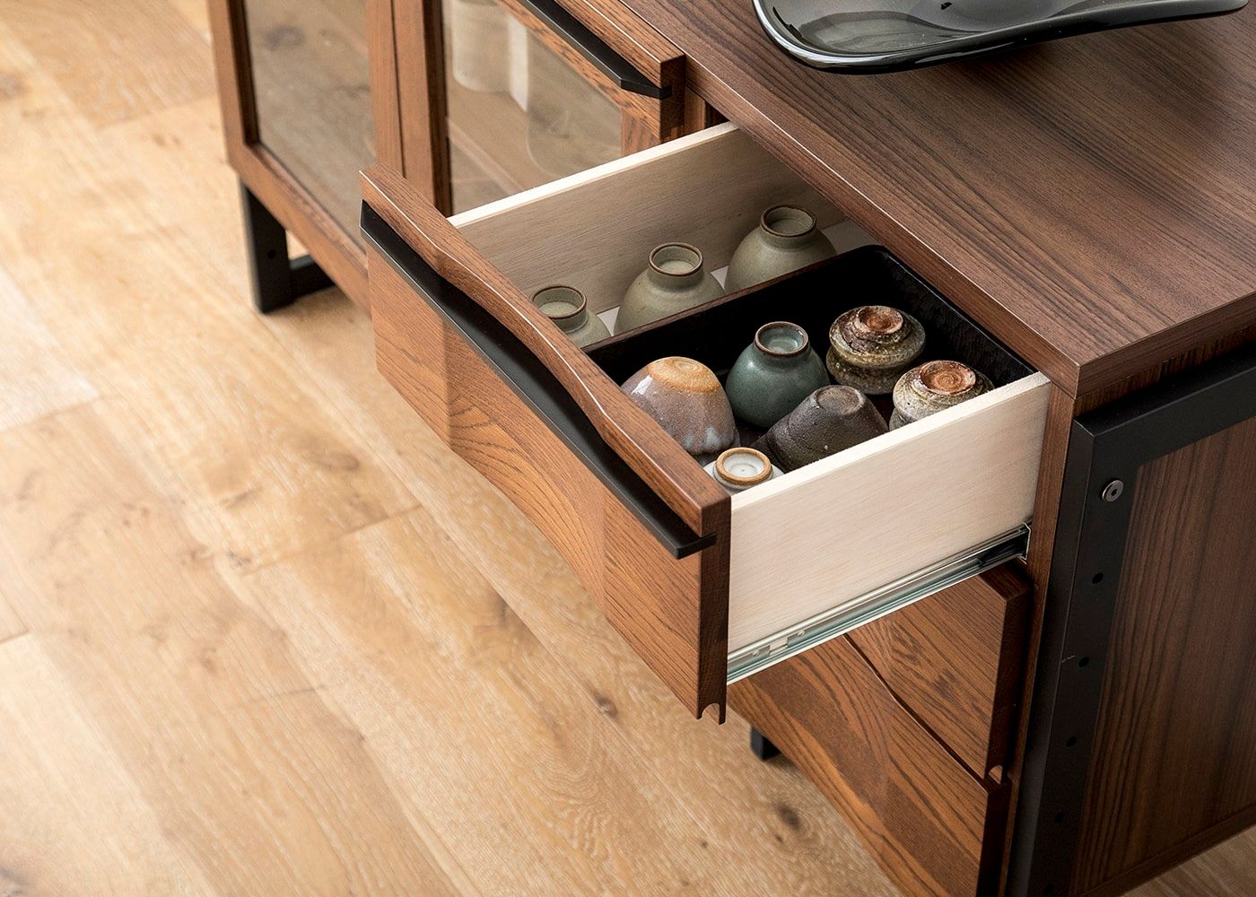 リビング周りの小物はもちろん、ダイニング周りの湯飲みや食器なども収納できる便利な引出が備わっています。(計3段)※引出の内部はグレインブラウン色(コート紙)に仕様変更になりました。在庫状況によってグレインブラウン色でのお届けになります。ご了承ください。