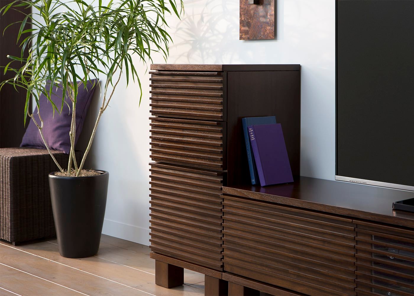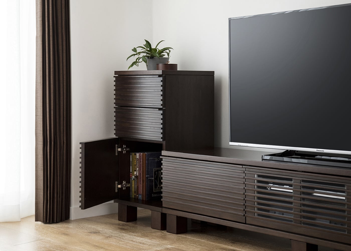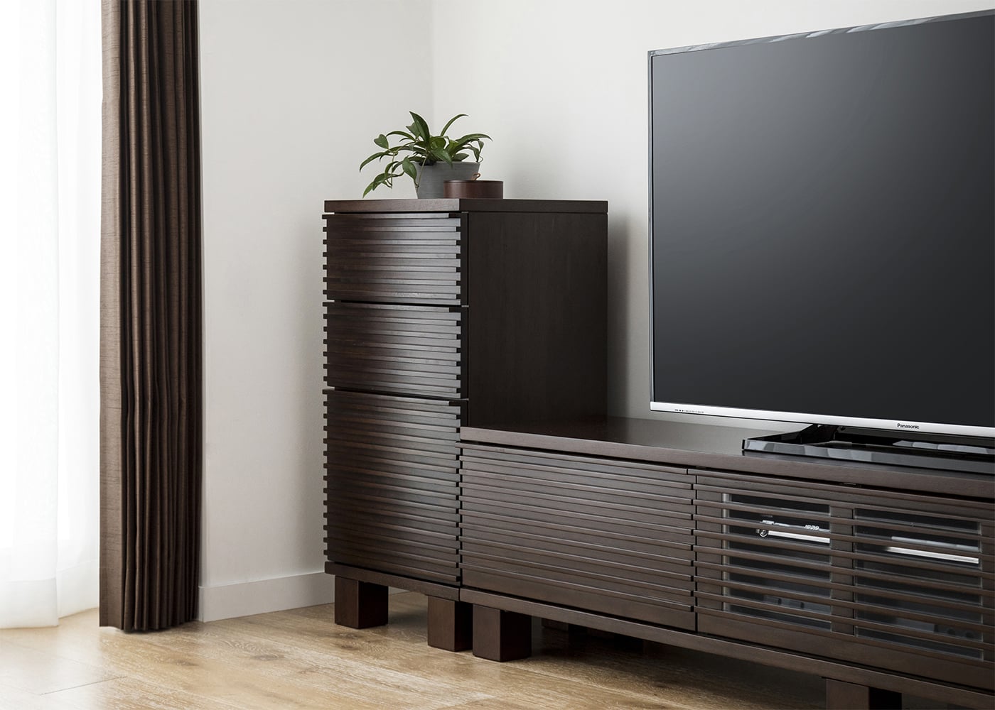 キャビネットやテレビボードの組み合わせ次第で、自分に合ったサイズやデザインの収納が作れます。はじめは単品で使っていても、将来お部屋が広くなった時には同シリーズの収納を追加して収納力が増やせるルーバーシリーズ。ライフスタイルに合わせて長く使い続けられる拡張性の高さが魅力です。(写真は一例です)