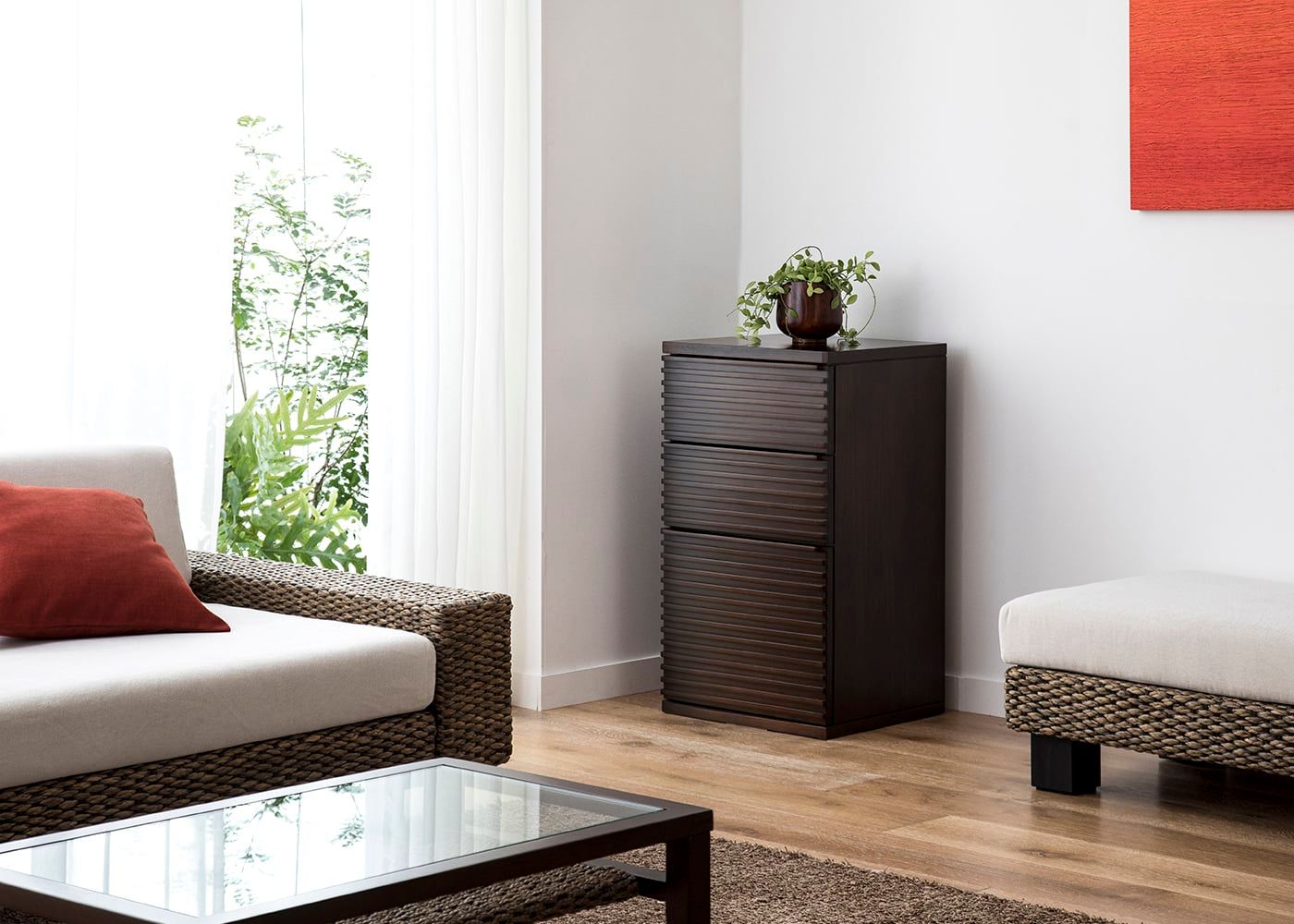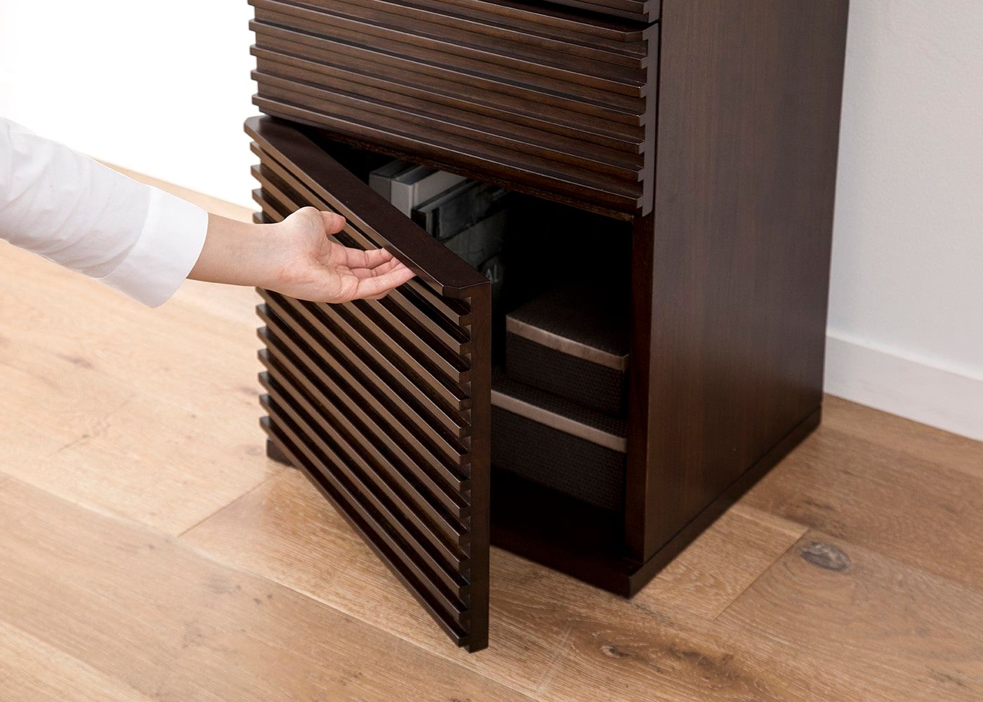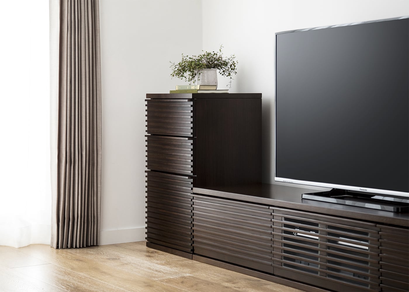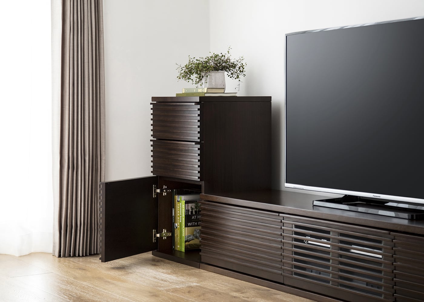 キャビネットやテレビボードの組み合わせ次第で、自分に合ったサイズやデザインの収納が作れます。はじめは単品で使っていても、将来お部屋が広くなった時には同シリーズの収納を追加して収納力が増やせるルーバーシリーズ。ライフスタイルに合わせて長く使い続けられる拡張性の高さが魅力です。(写真は一例です)