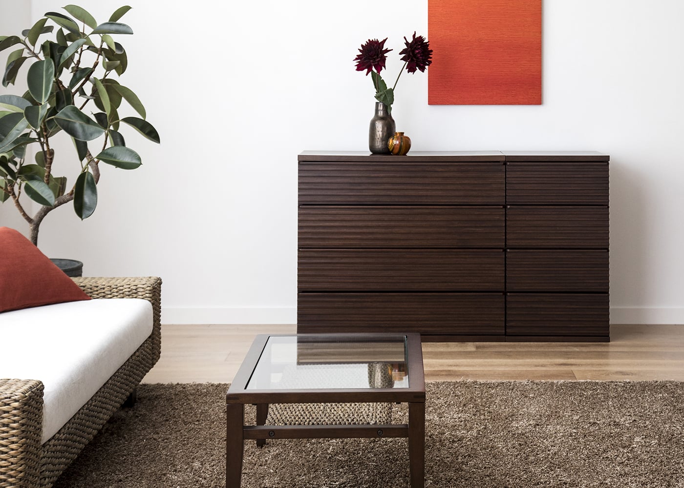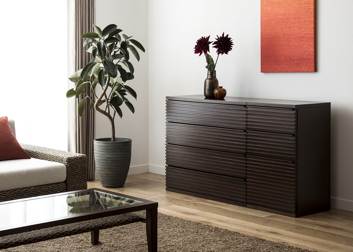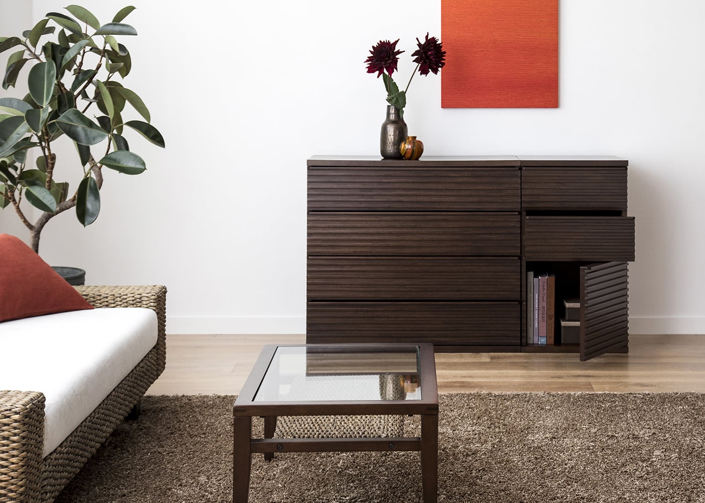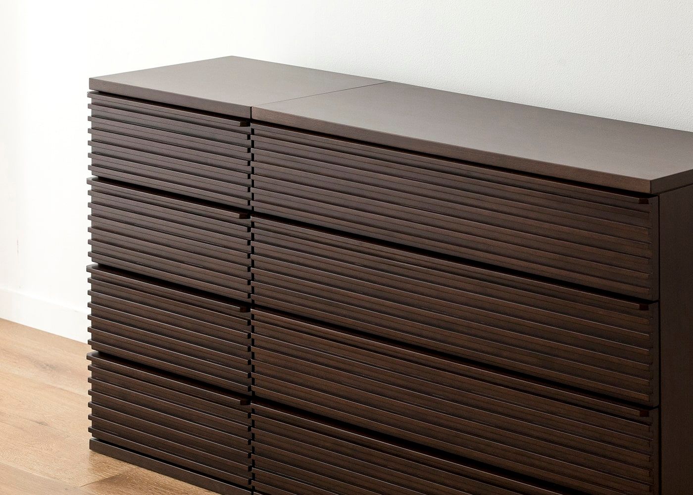 引出タイプの850(D2)を2台並べることで美しいルーバーがより際立ち、魅せる収納として演出できます。シックなグレートーンでインテリアコーディネートして、ホテルライクな特別感のある暮らしを楽しんでみては。(写真の組み合わせで使用する時は850 D2を2点並べてご利用ください)