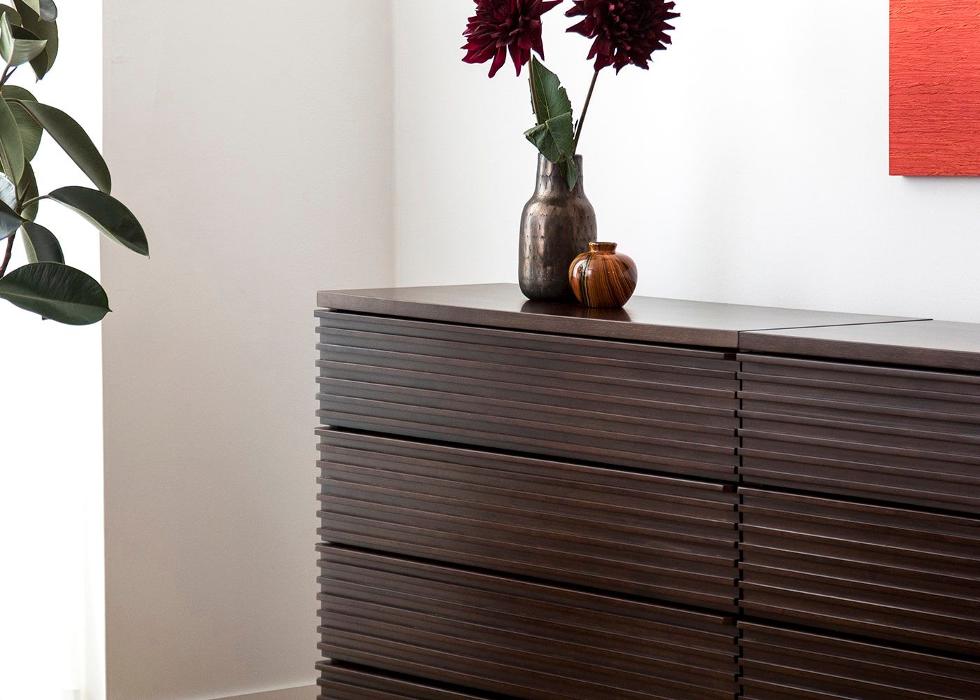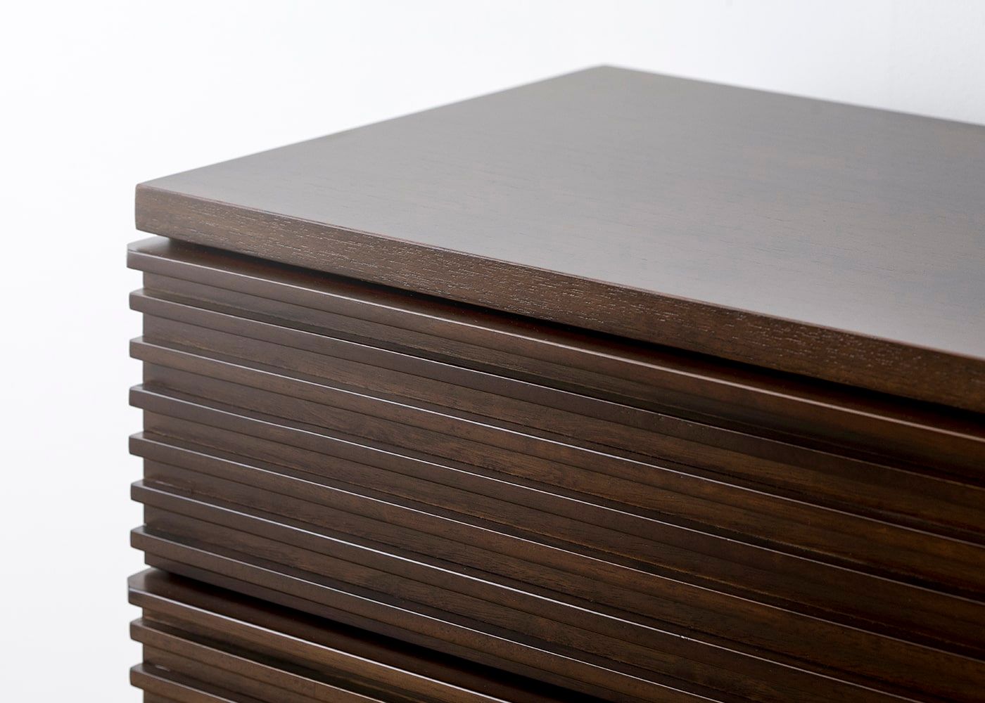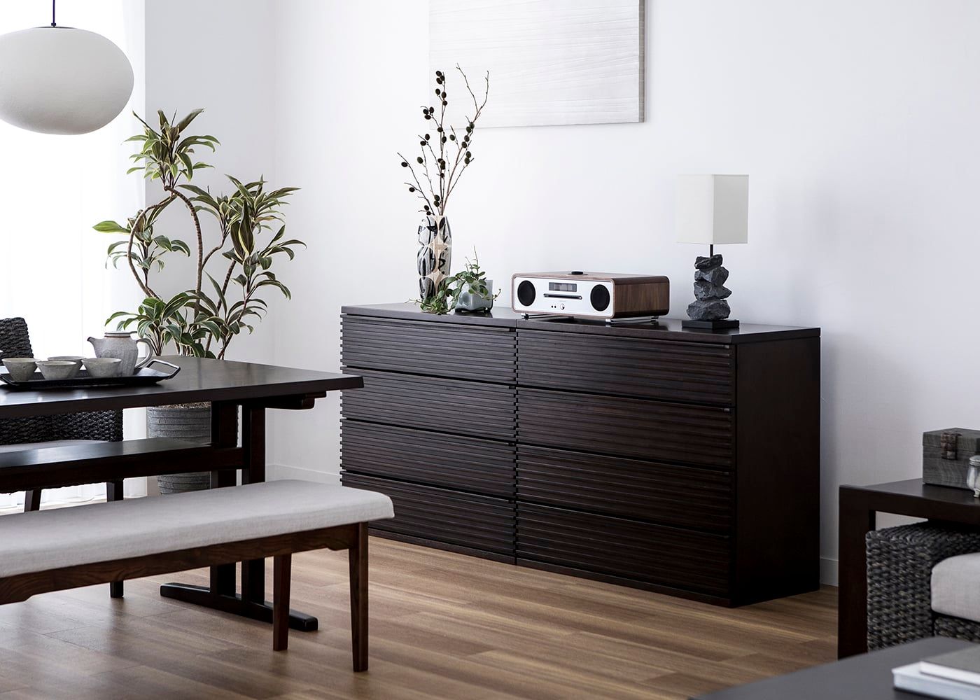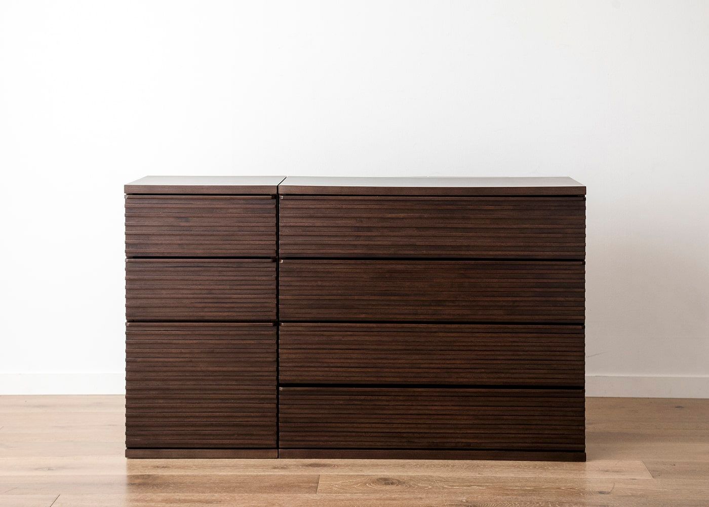 引出タイプの850(D2)を2台並べることで美しいルーバーがより際立ち、魅せる収納として演出できます。シックなグレートーンでインテリアコーディネートして、ホテルライクな特別感のある暮らしを楽しんでみては。(写真の組み合わせで使用する時は850 D2を2点並べてご利用ください)