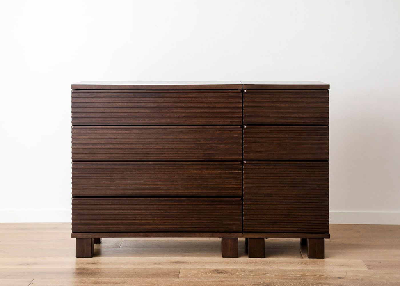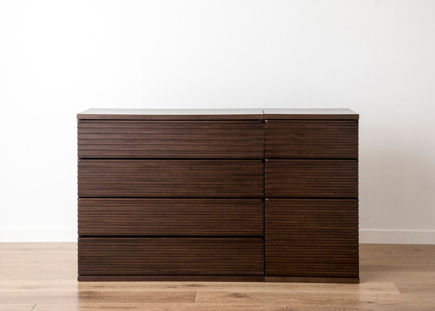 お部屋のサイズや使用用途に合わせて、収納を増やしたい方におすすめのセットです。キャビネットを並べることで、どこまでも広がる波の様子を表現しています。ゆっくりと打ち寄せる波の穏やかさと整然さを体現したルーバーシリーズの魅力がより一層高まります。(写真は850 D2+425 D1 R 右置き セット、幅1275mm)