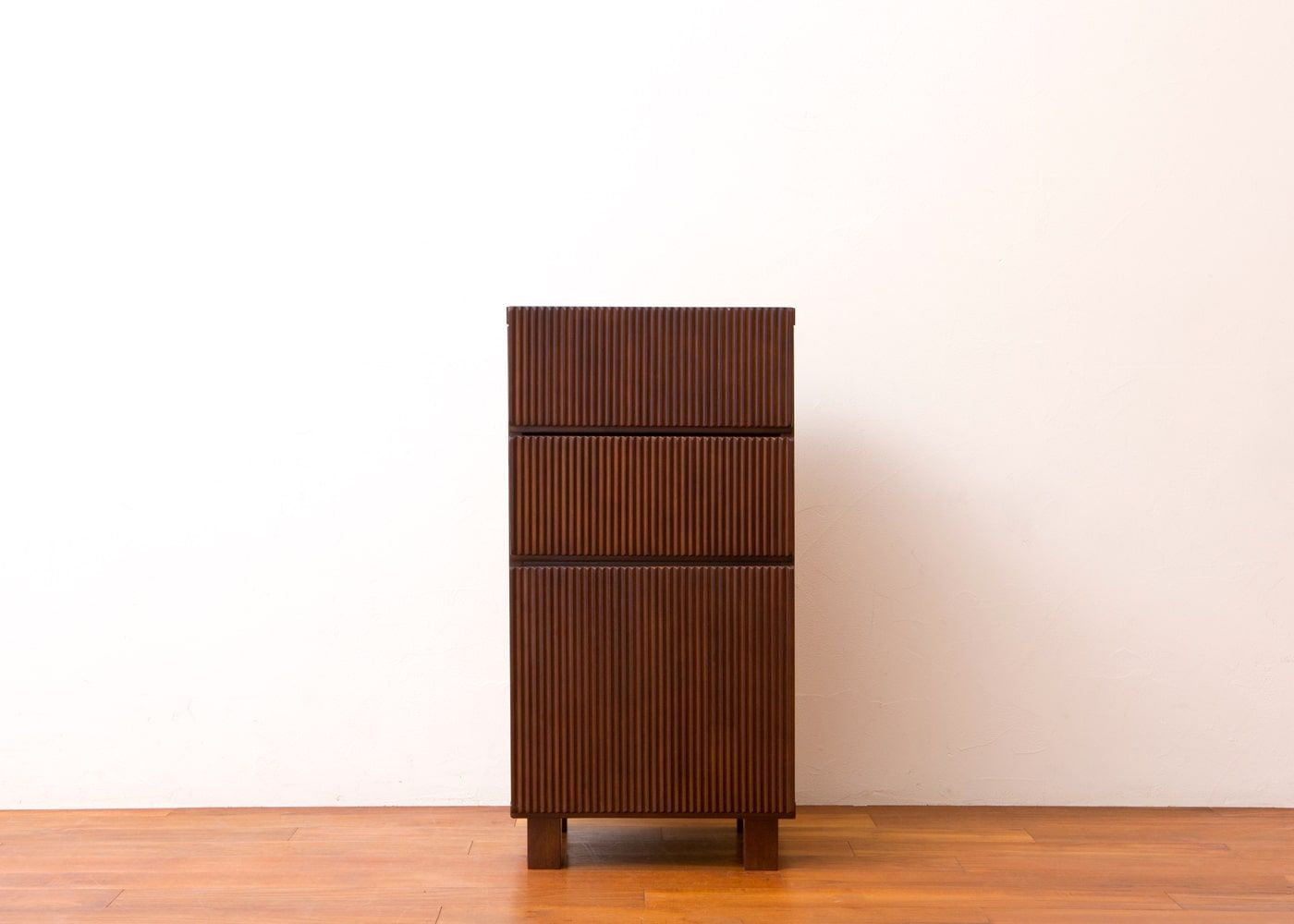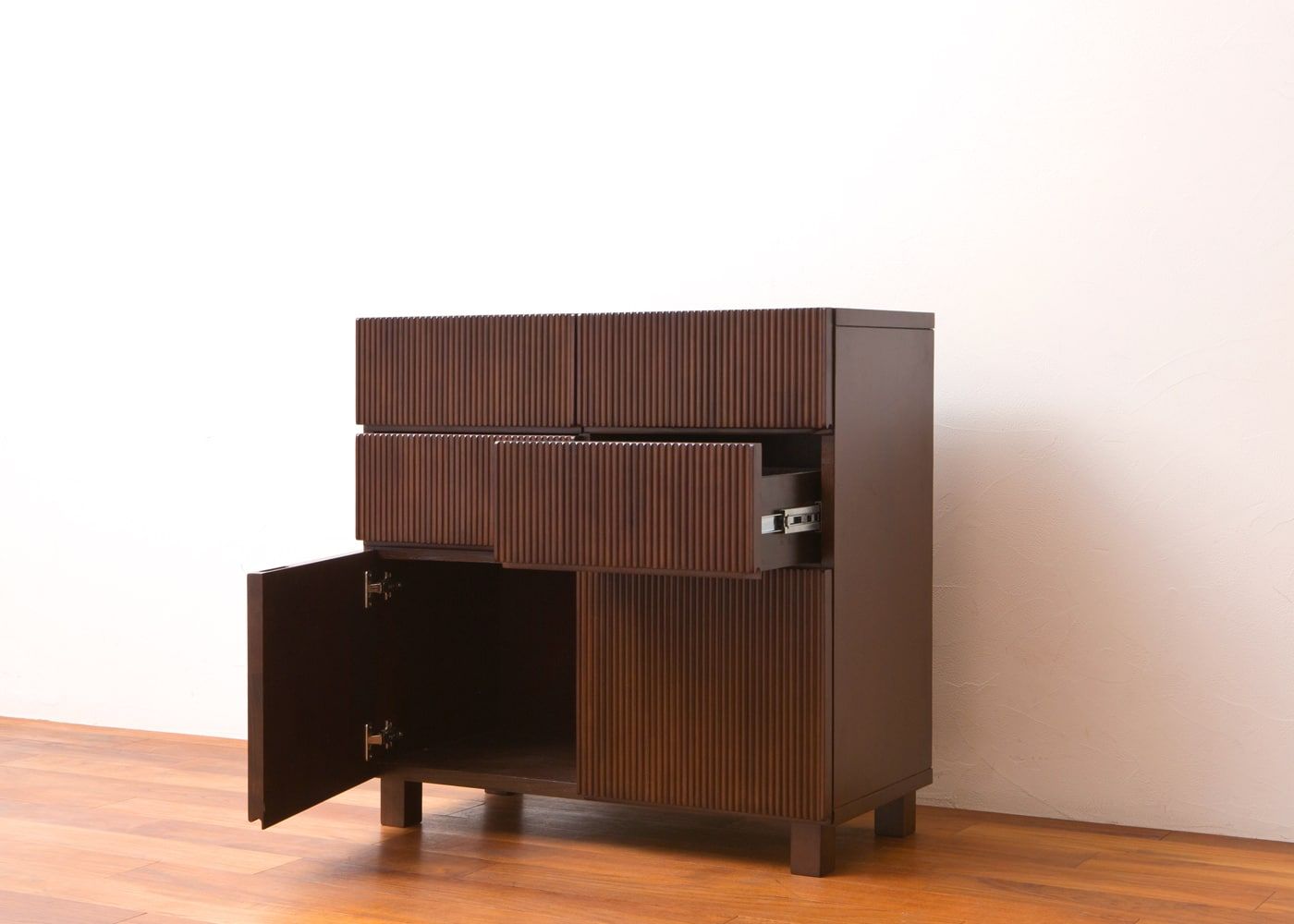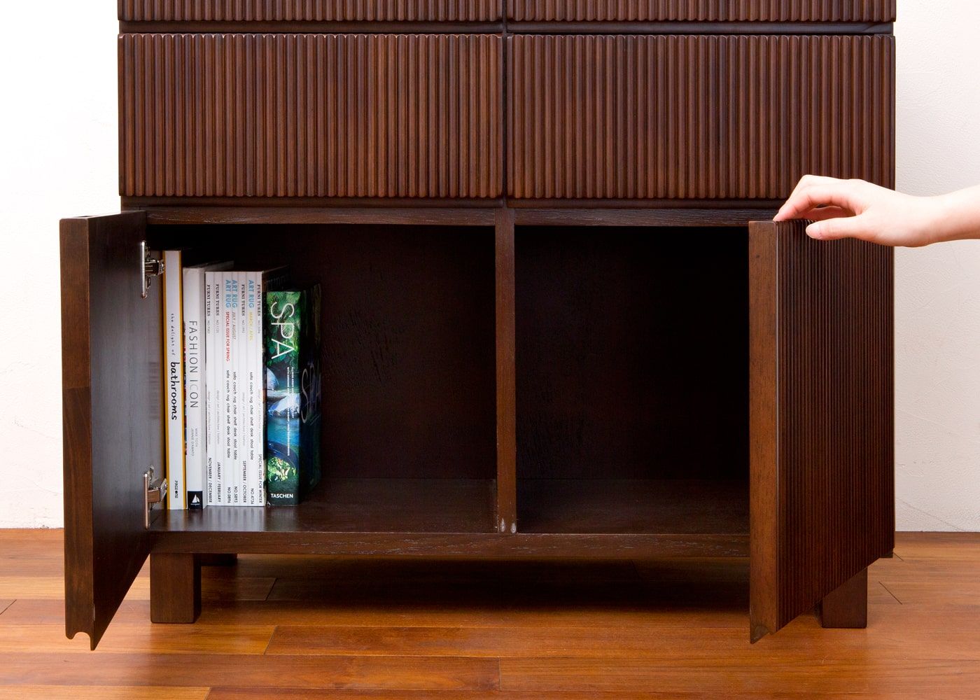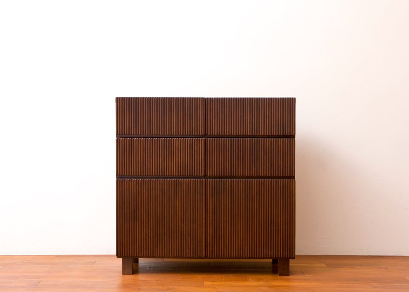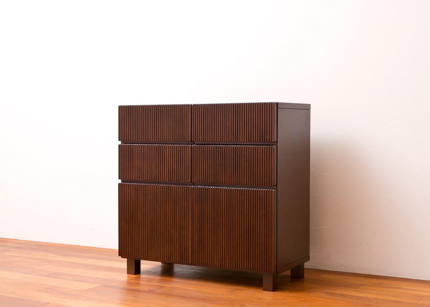 アジアらしい繊細で美しい縦の流れを「線と溝の連続性」で表現した「レン・シリーズ」のキャビネットです。写真はレン・キャビネットRv01タイプ。