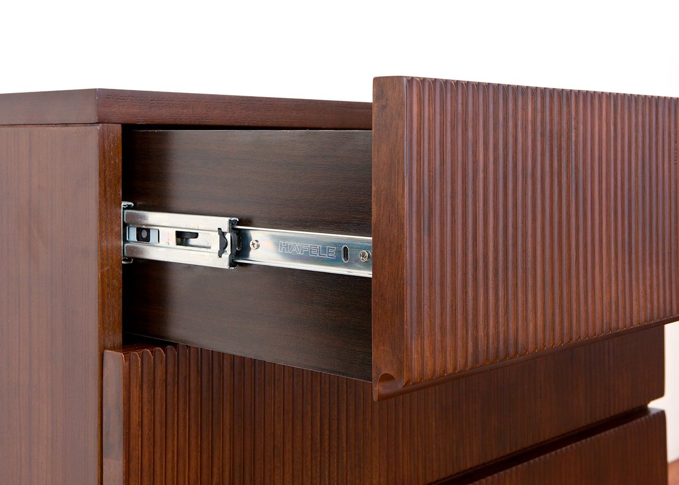 引出しには、スムーズで安定性のある開閉を可能にした「ボール・スライドレール」を採用しています。安心して長くお使い頂けます。