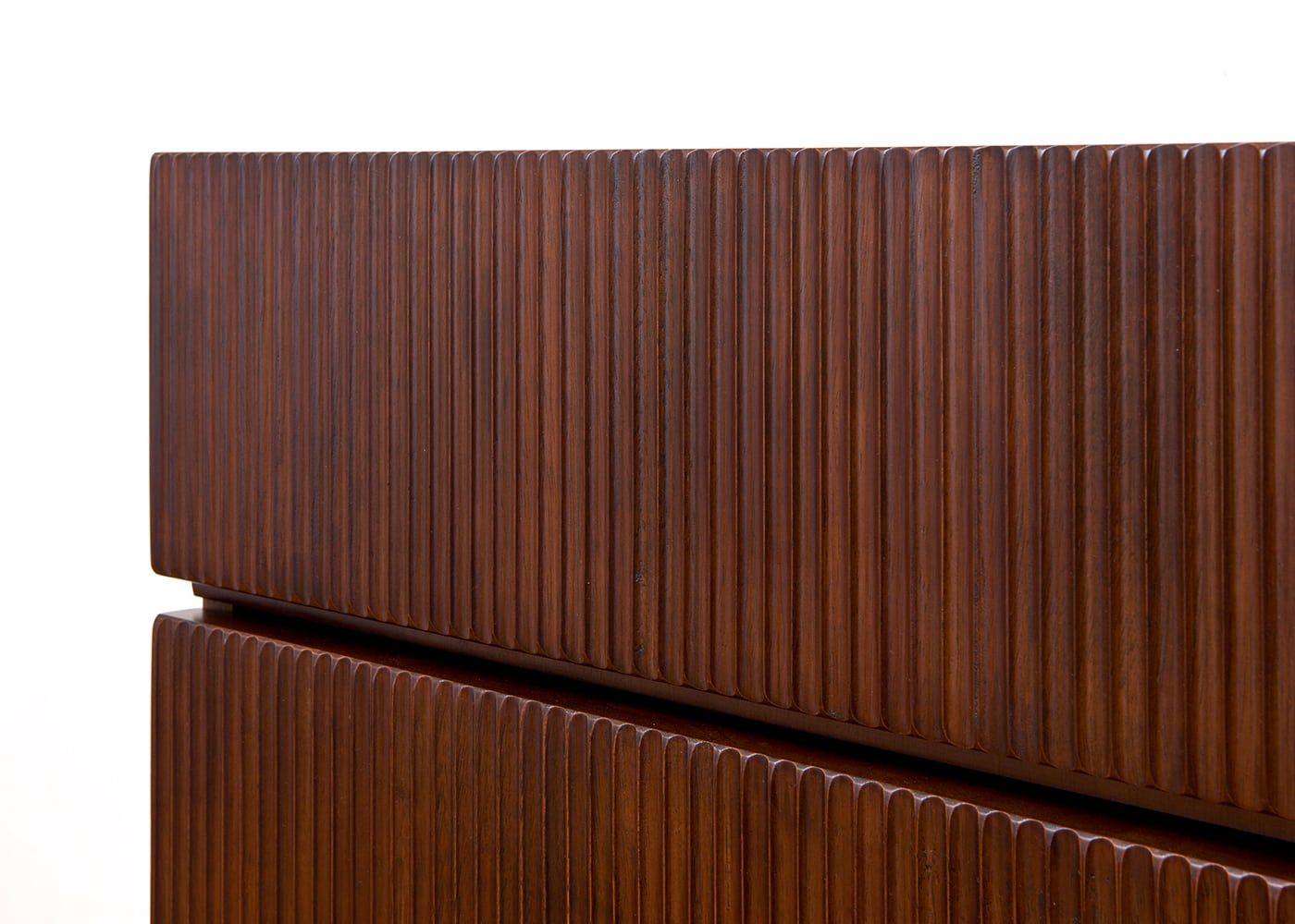 「線と溝の連続性」を表現するために伝統技法「なぐり加工」を施した前板のデザインがレン・キャビネットの最大の魅力です。連続した繊細な線と溝からなる縦ラインが、絹糸を垂らしたような光沢感と流れのあるデザインです。
