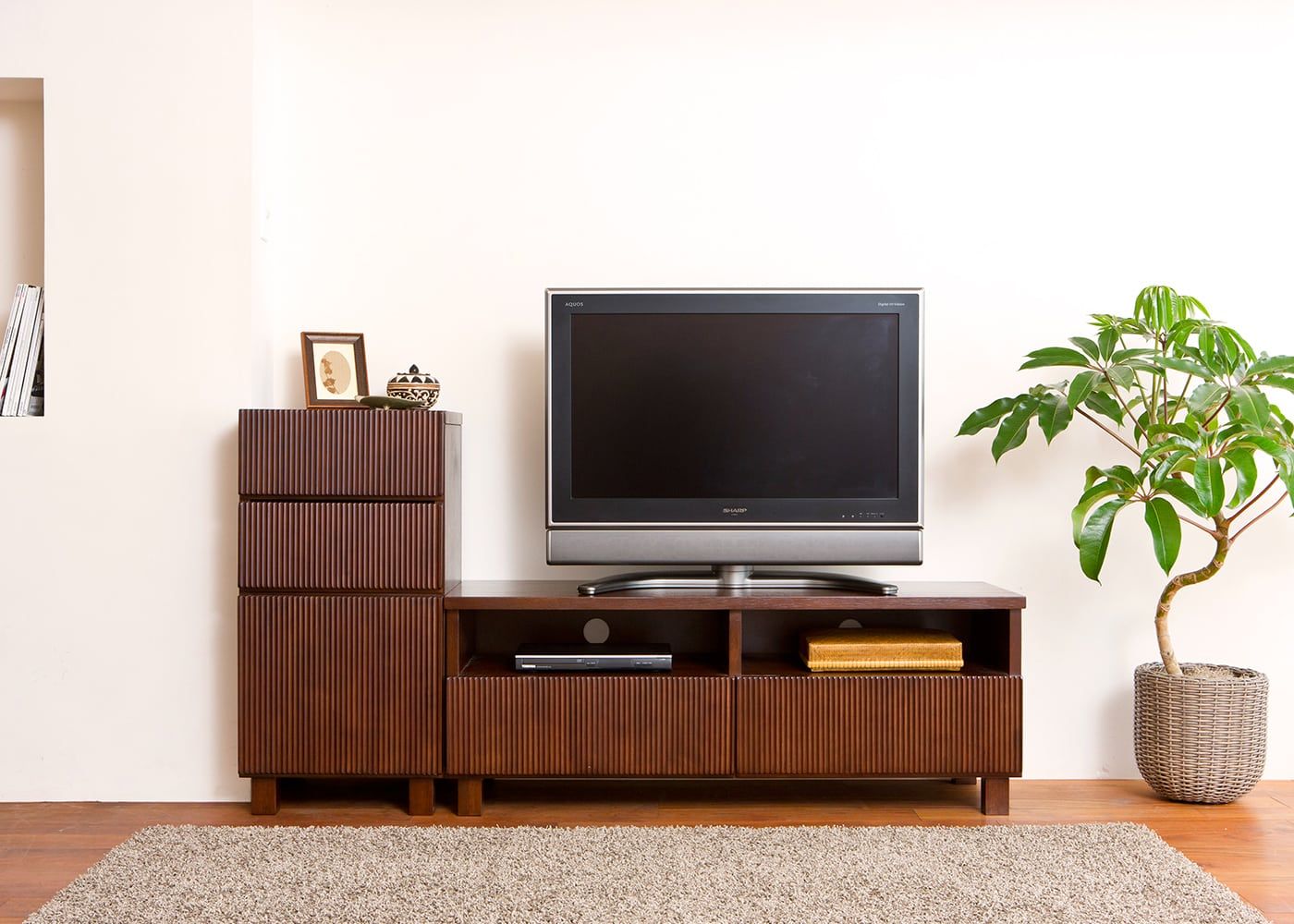 レン・シリーズのテレビボードと組み合せてもご使用いただけます。写真はSv01タイプとレン・テレビボードとのセット例。(テレビボードは1200タイプ、テレビは32型)