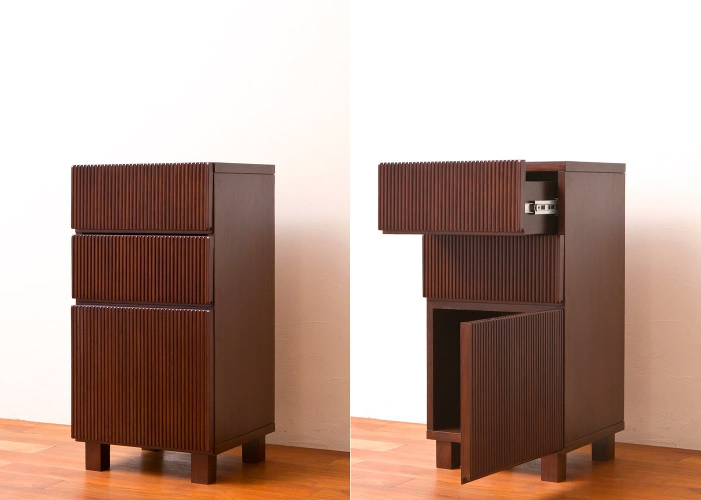 上から1段目・2段目は引出し式、3段目は両開きの扉式収納です。写真はRv01タイプ。