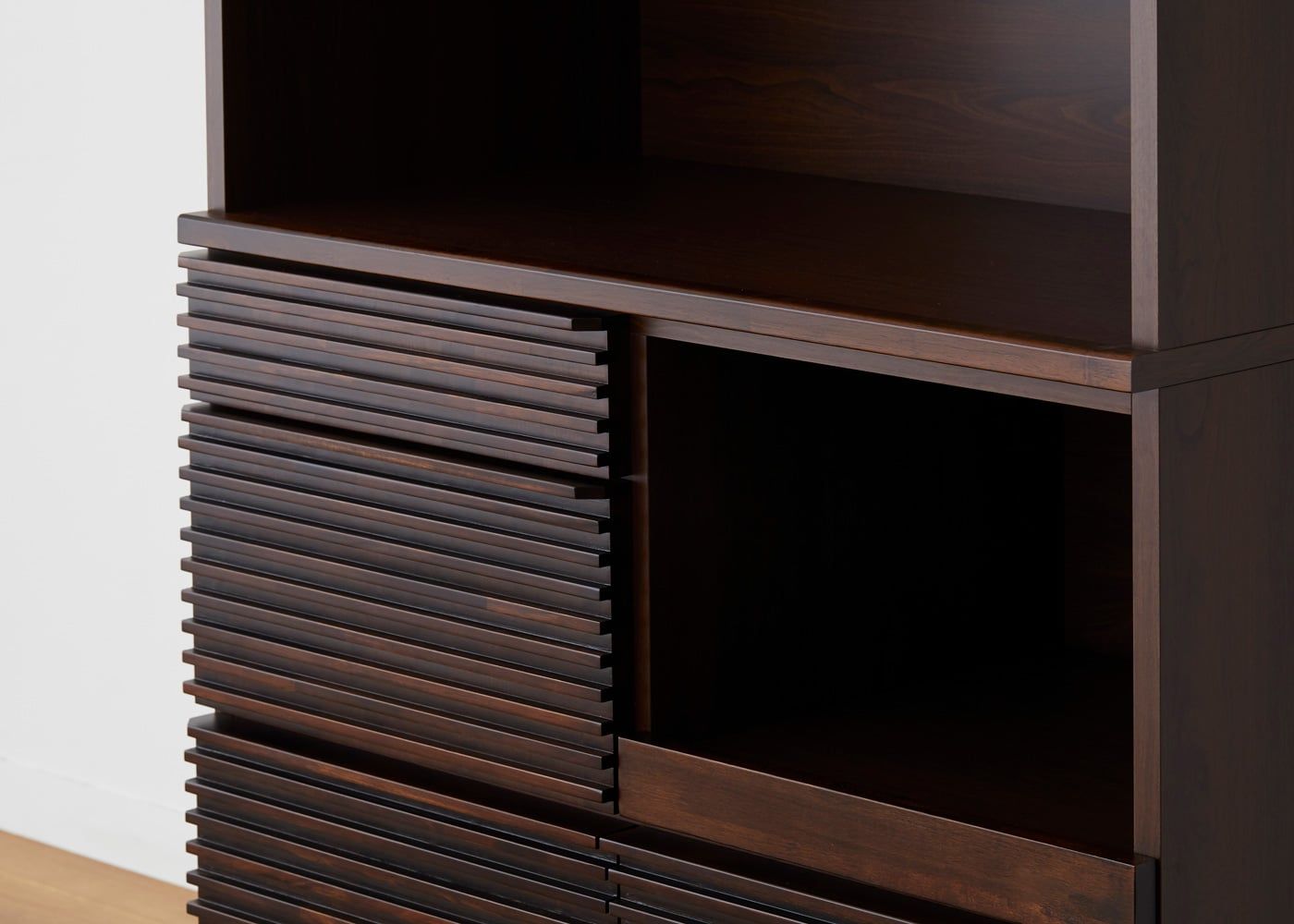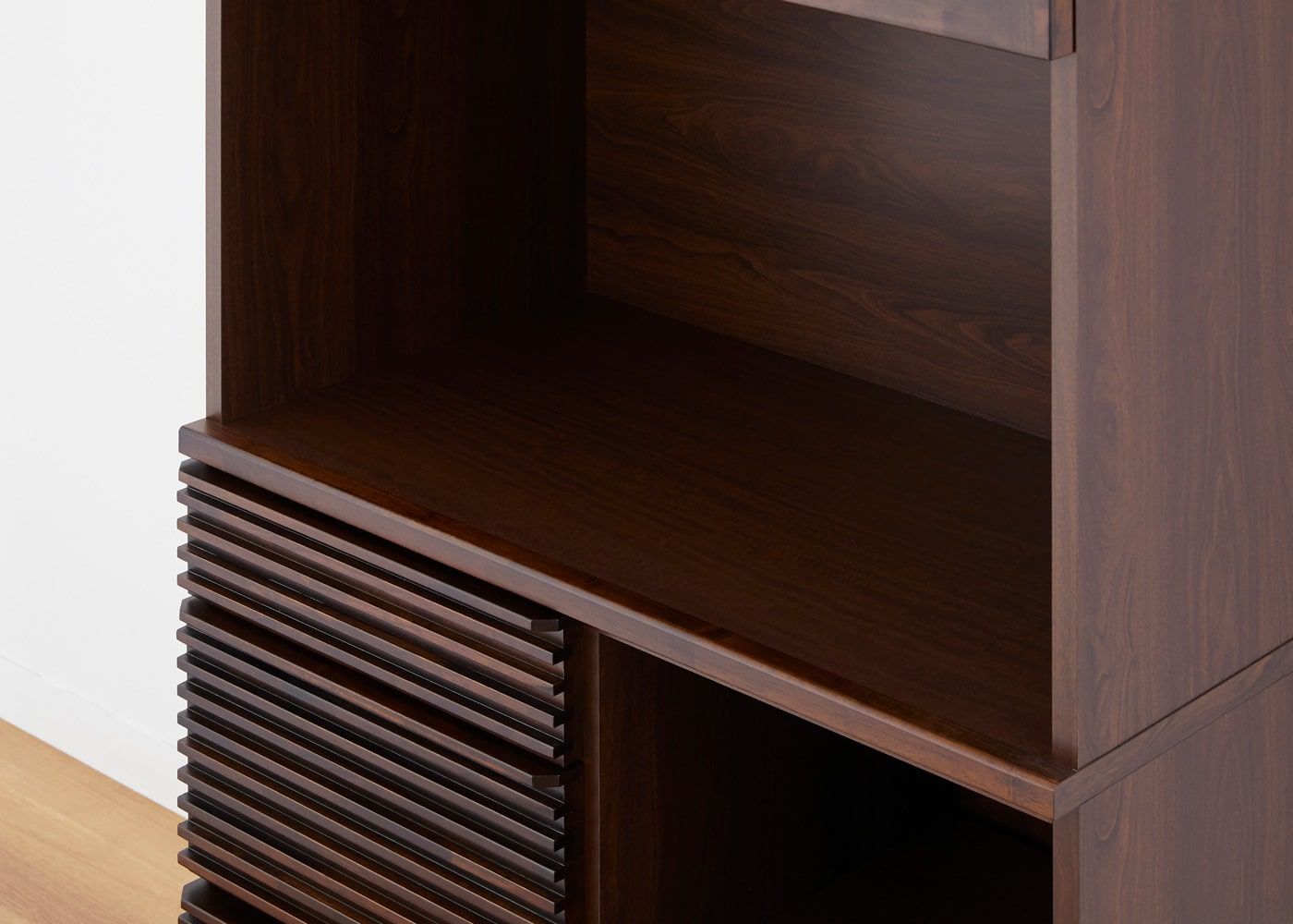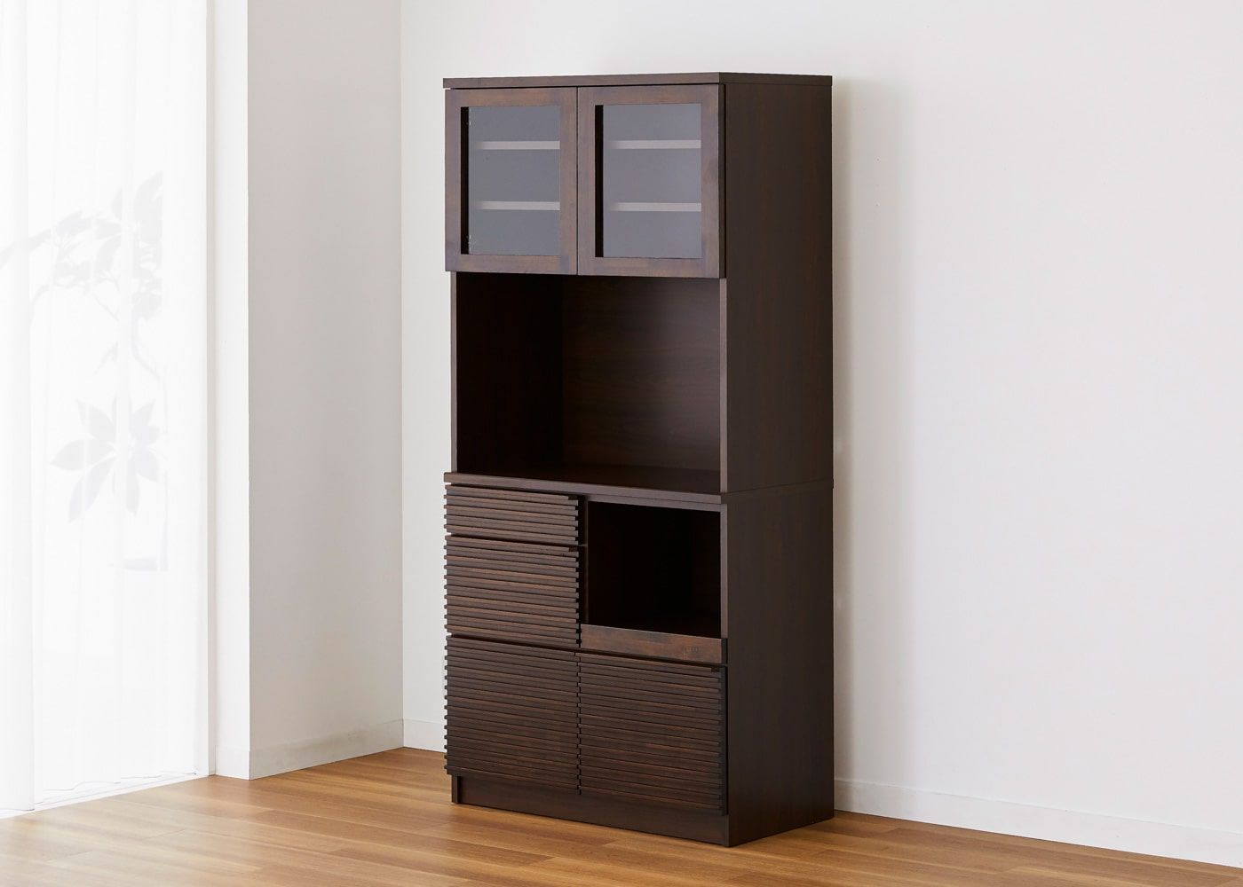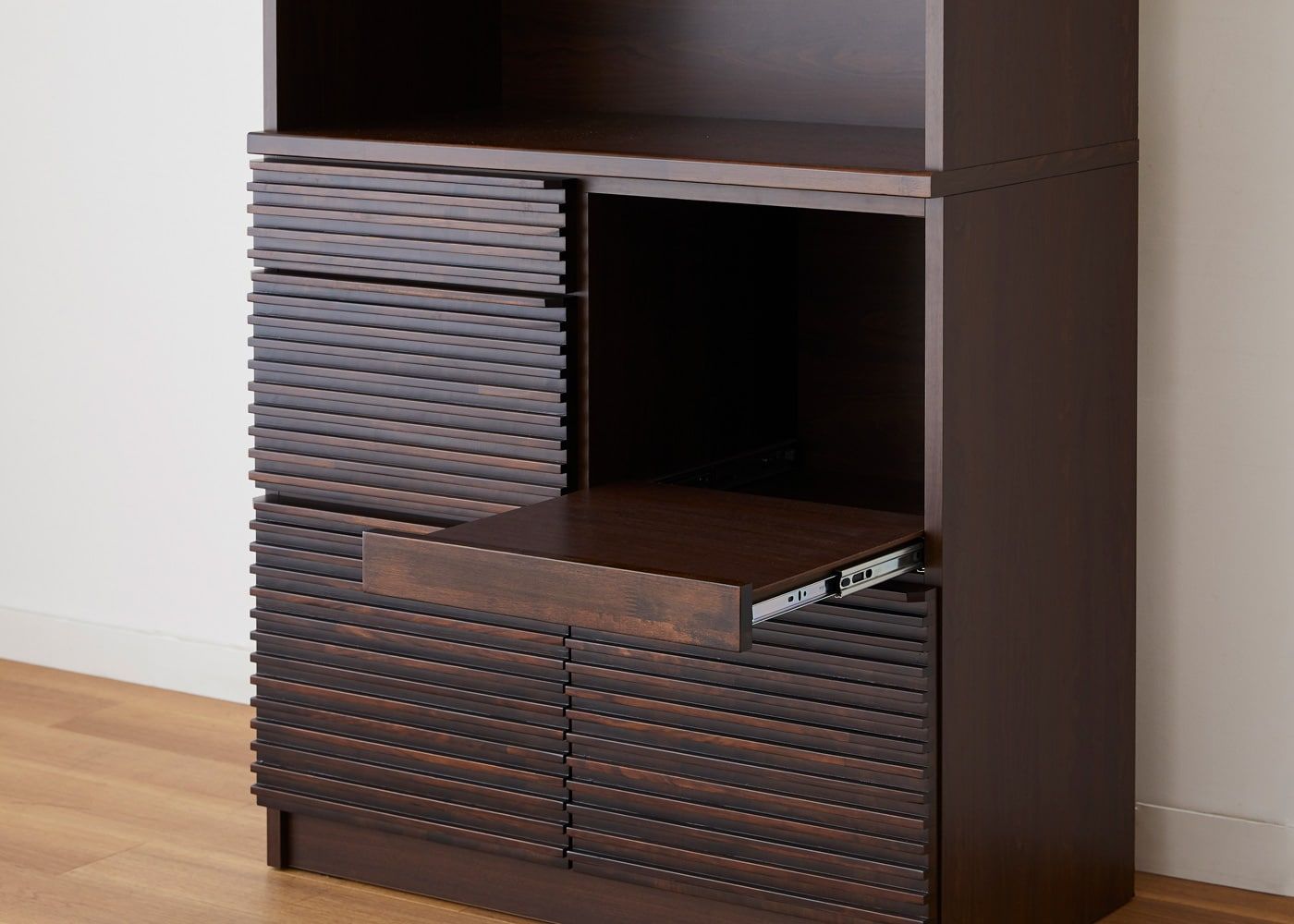 重厚感のあるダークブラウンと、無垢材を用いた水平ラインによって洗練感が漂います。収納力や機能性だけでは無く、デザイン性も求める方にお薦めです。