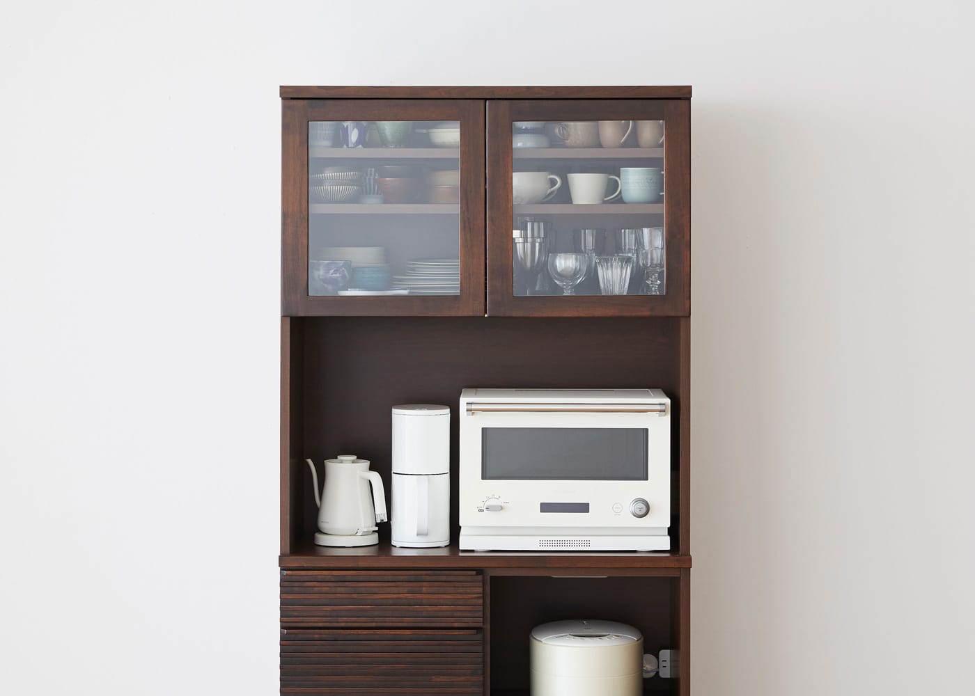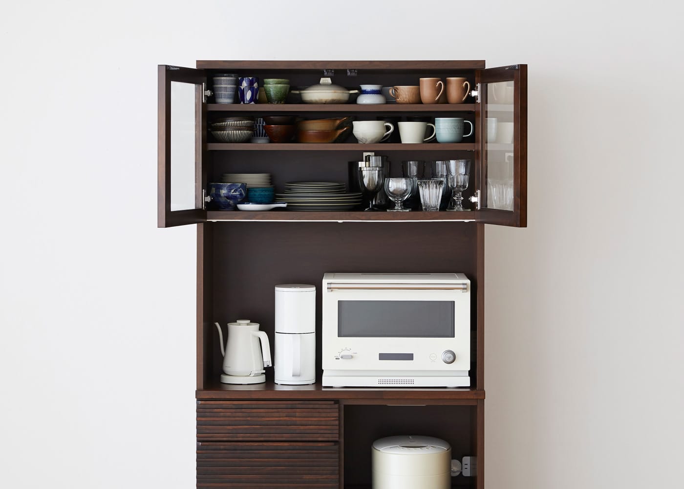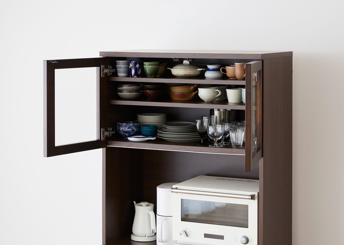 上段のオープン収納スペースは、電子レンジやコーヒーメーカー、ケトルなどのキッチン家電を数点並べて配置できます。