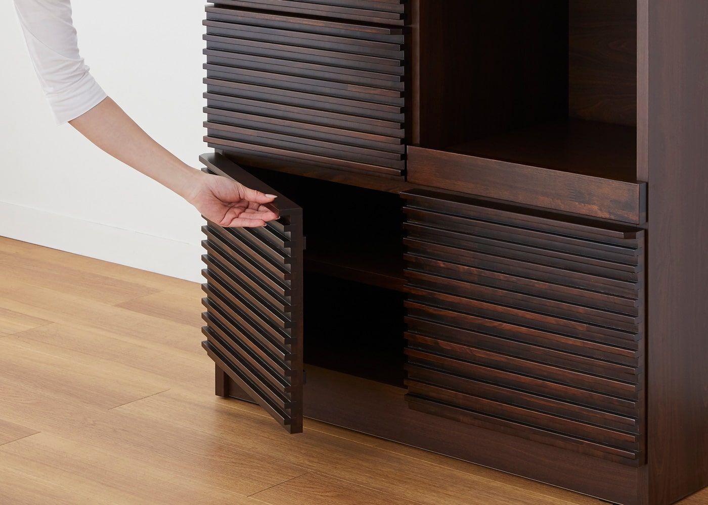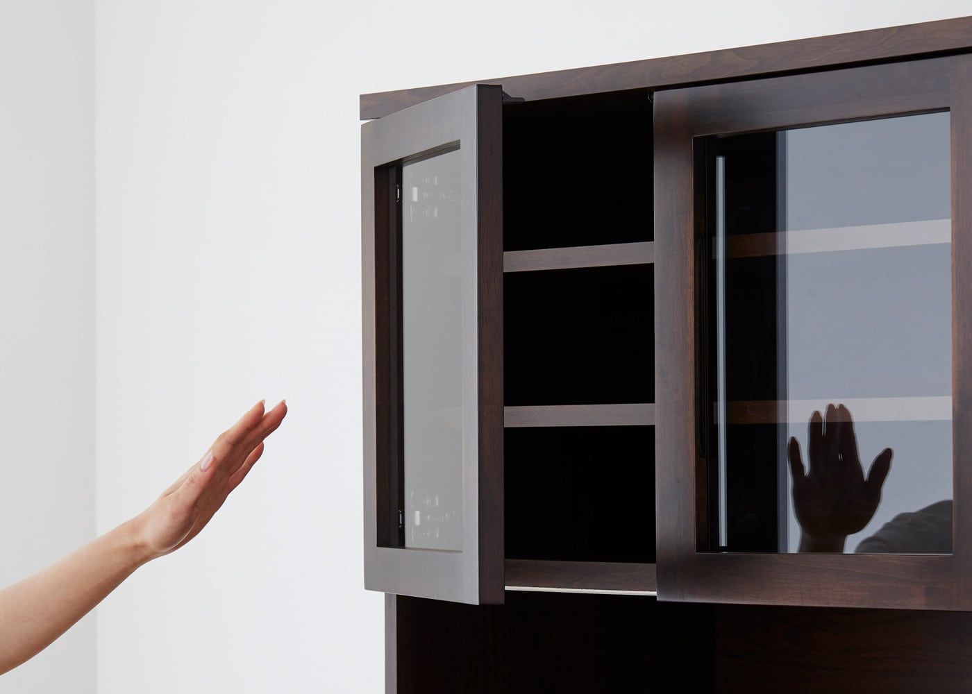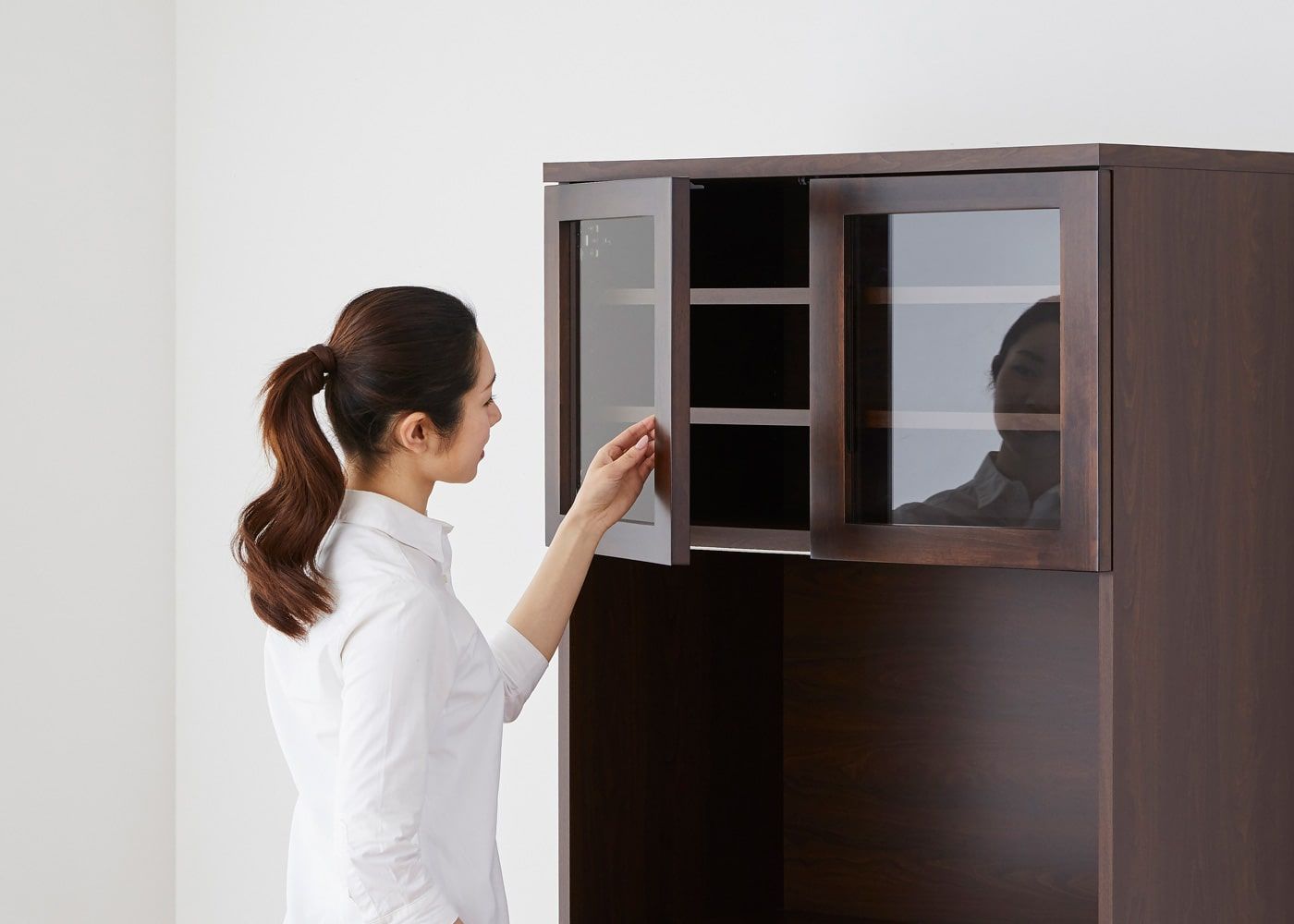 上段のガラス扉は、木枠フレームの内側に指を掛けて開くことができます。(モデルは身長167cmの女性)