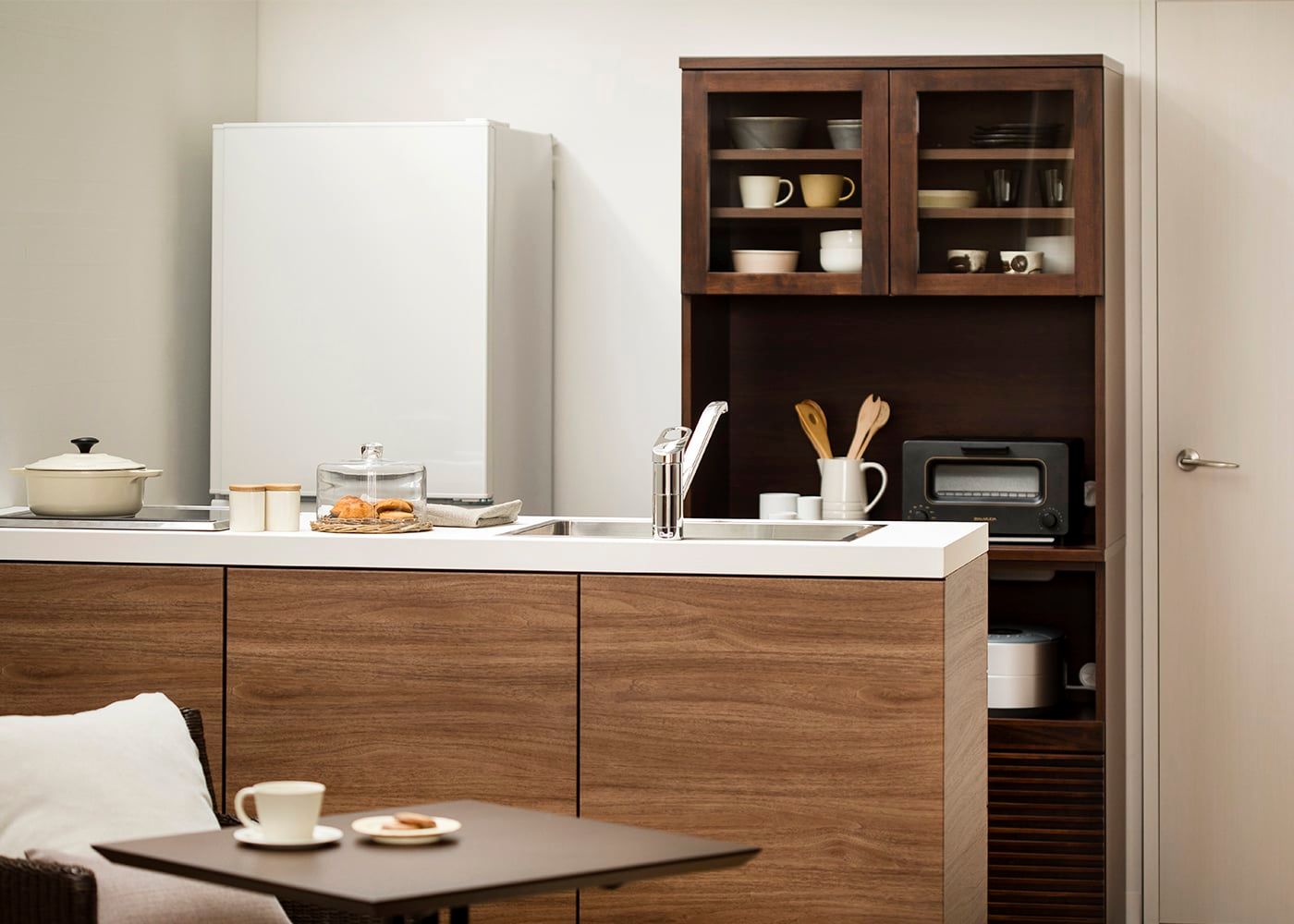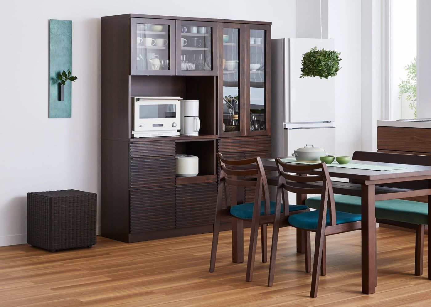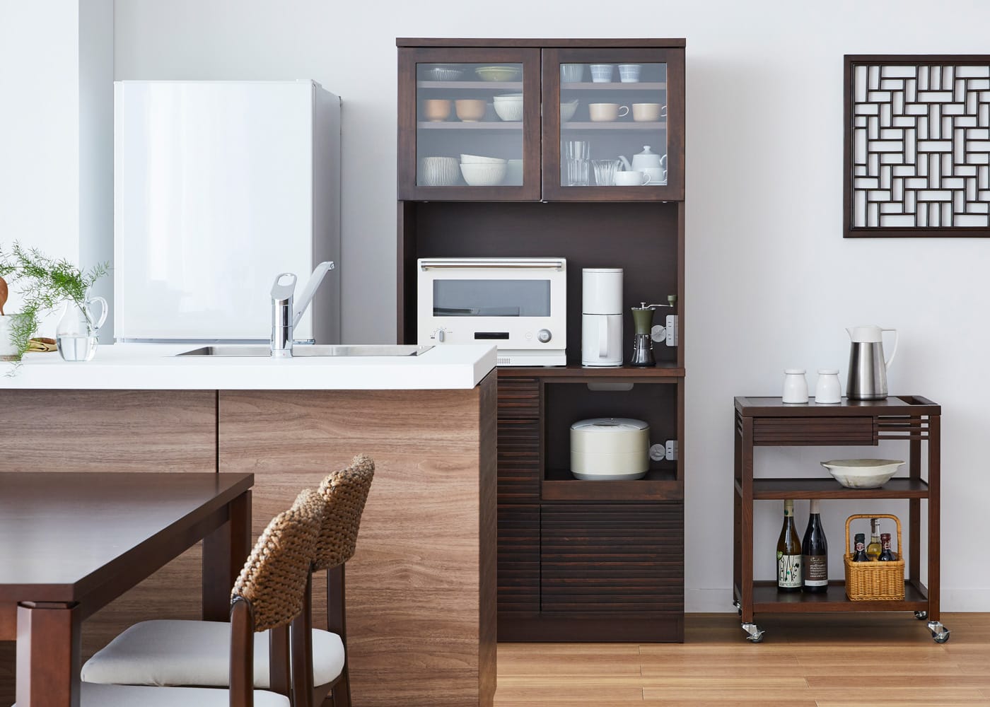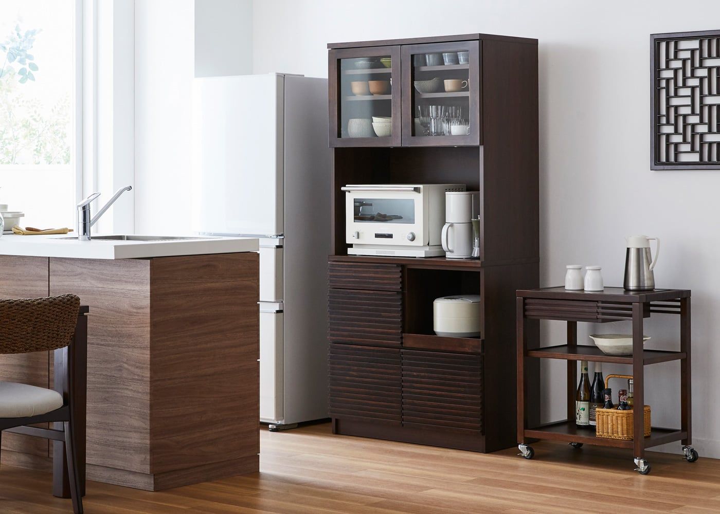 一人暮らしの1LDKに配置したコーディネート例。870タイプのキッチンボードは、マンションなどのコンパクトなキッチン周りに丁度良いサイズ感です。また、1台あるだけで食器やグラスから最低限の家電を設置できるため、快適なシングルライフが送れます。