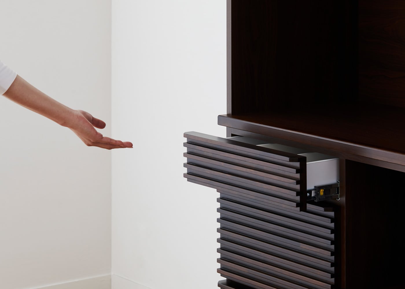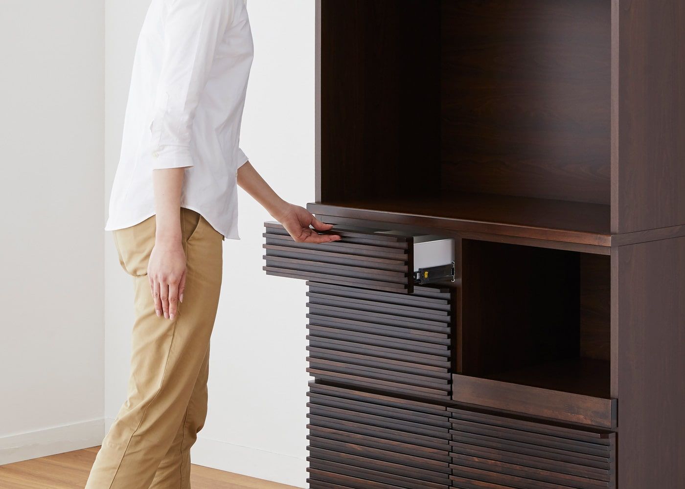 中段の引き出しは、前板の上にある取っ手に指をかけて引き出せます。(モデルは身長167cmの女性)