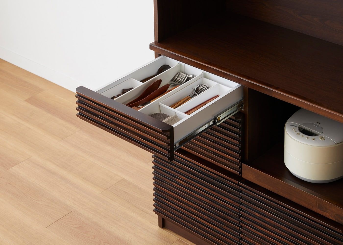 引き出しの1段目は深さ70mmです。カトラリーやコースター、箸置きなど細かいアイテムを収納できます。また、引き出しには可動式の仕切り板を2枚付属しています。