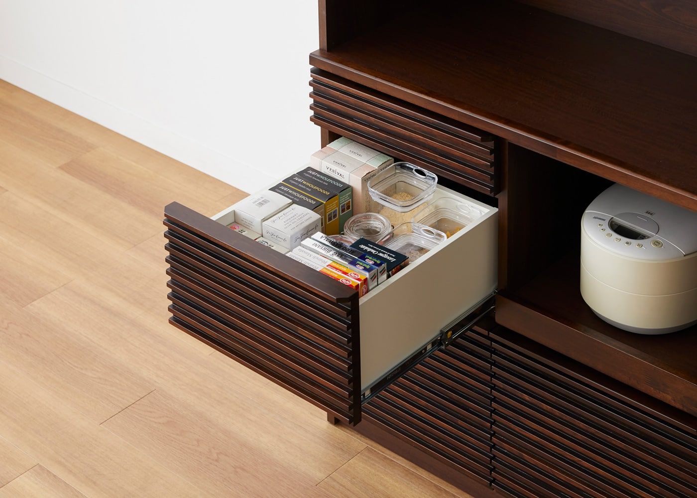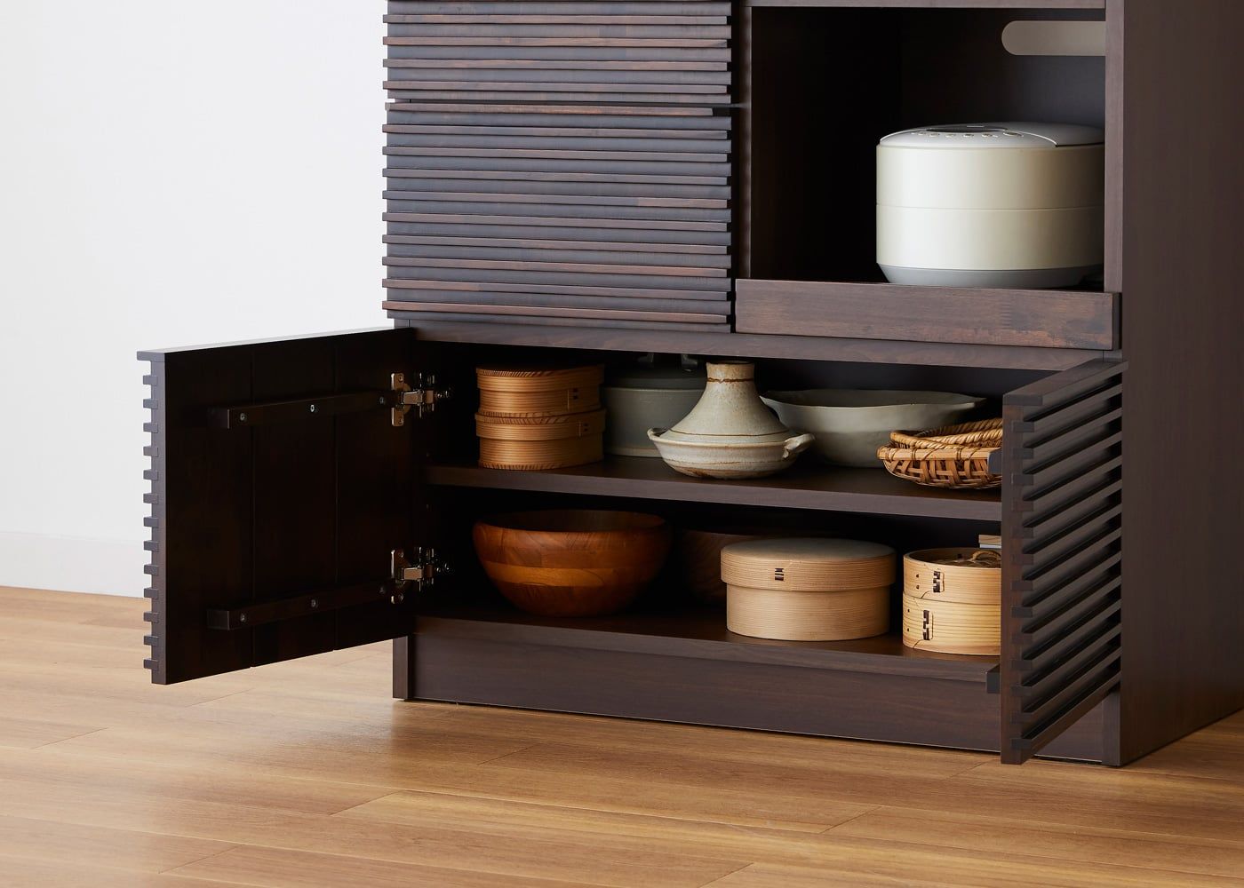 ルーバー・キッチンボードv02 870はデザイン性だけでは無く、充実した収納力も魅力です。細かい食器やグラス類、様々なキッチン家電まで、日々の暮らしに必要なアイテムをたくさん収納できます。