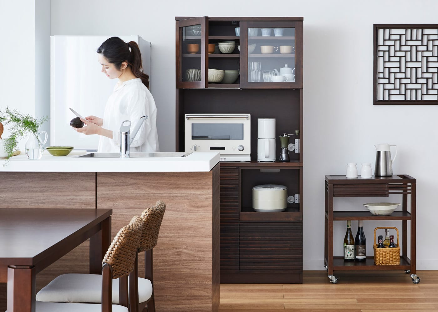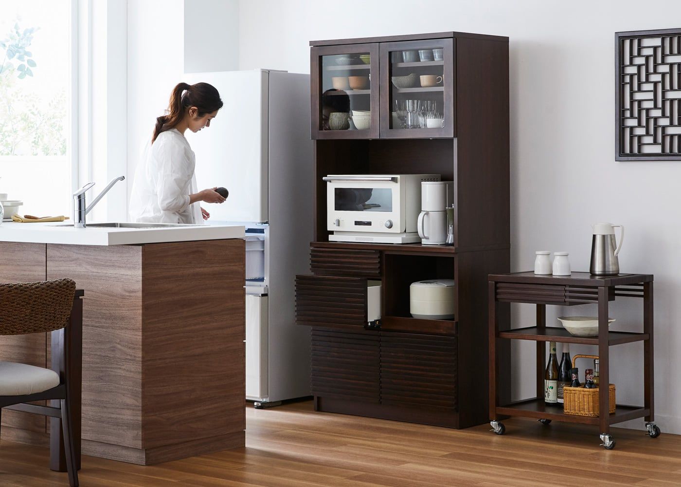 デザイン性に加えて、便利な収納力と機能性を併せ持ったキッチンボードです。毎日の暮らしに欠かせない料理の時間、キッチンで過ごす時間を楽しく過ごせます。(モデルは身長167cmの女性)
