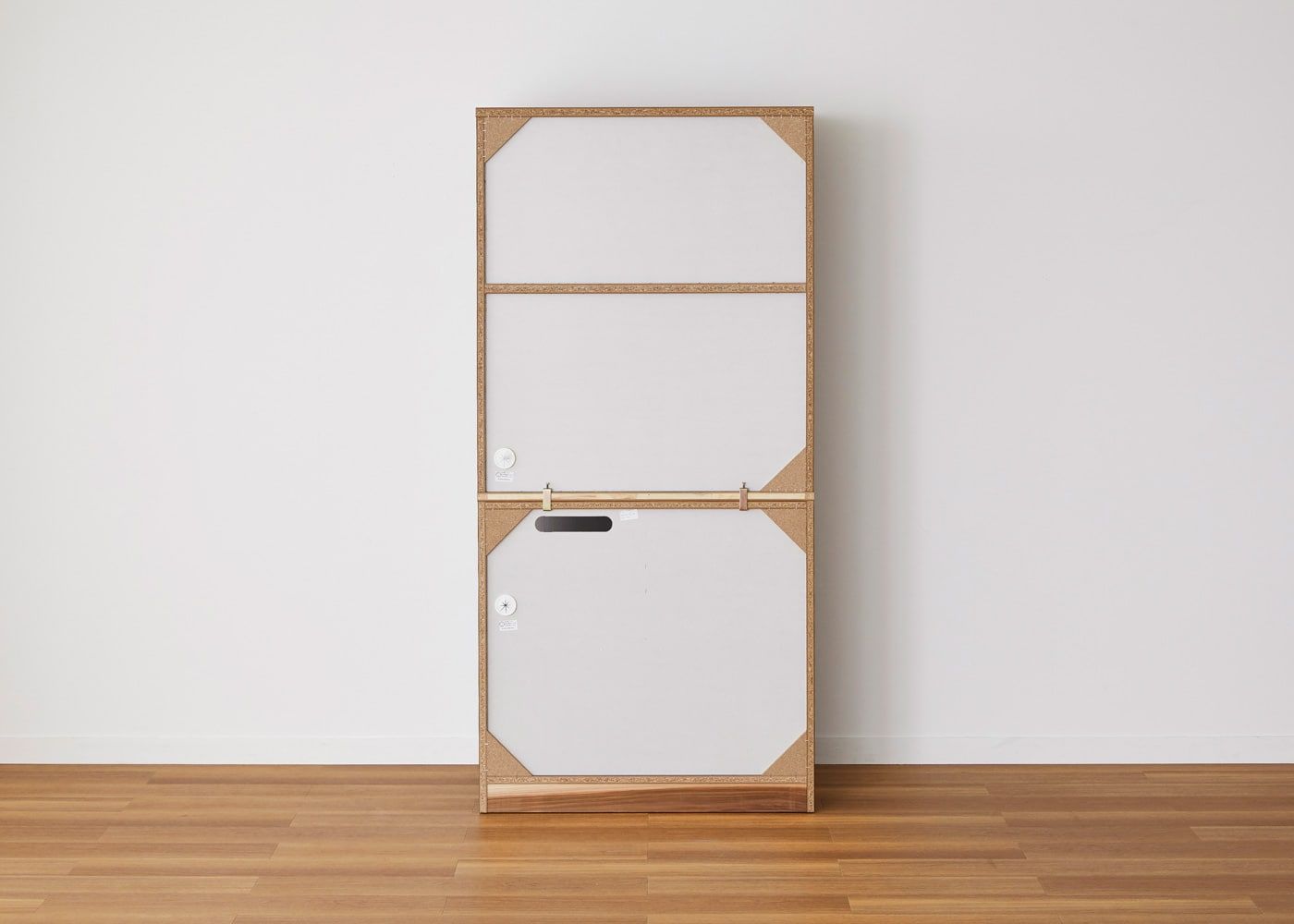 背面には過剰な加工や塗装をせず、エコな仕上げになっています。上段と下段はネジ止め+金具で固定します。