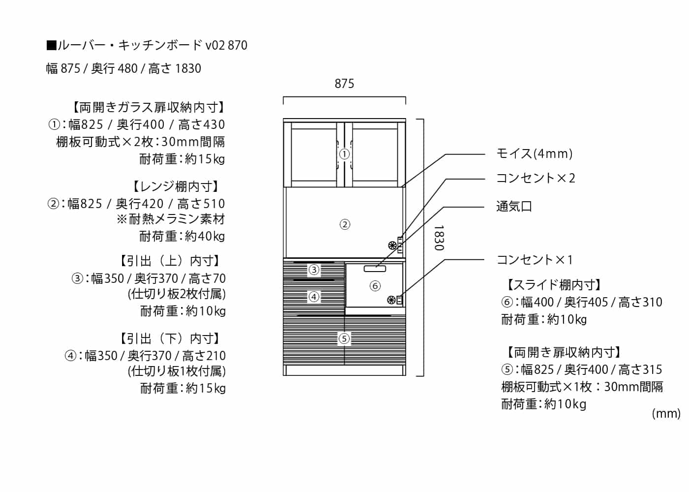 幅875 / 奥行480 / 高さ1830 ※単位は mm