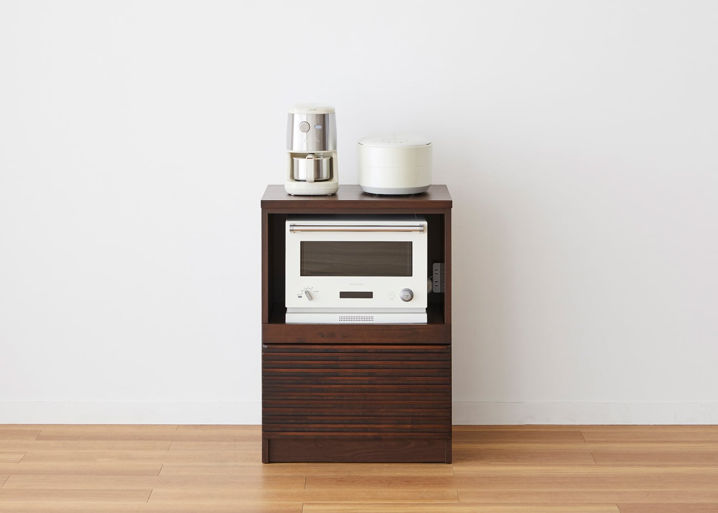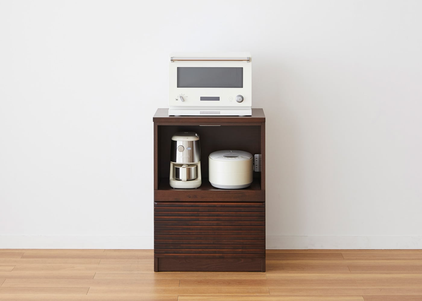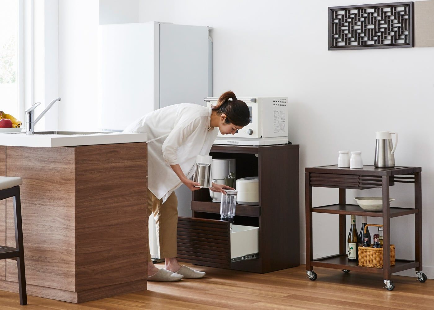 ルーバー・キッチンカウンターv02 600はデザイン性だけでは無く、コンパクトな収納力も魅力です。天板上のスペースやスライド収納スペースには、必要最低限のキッチン家電を配置できます。