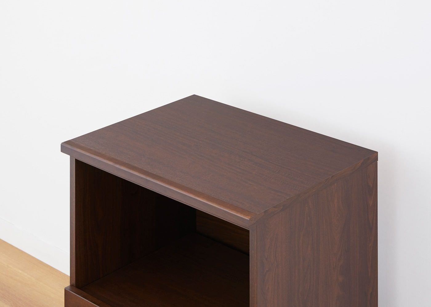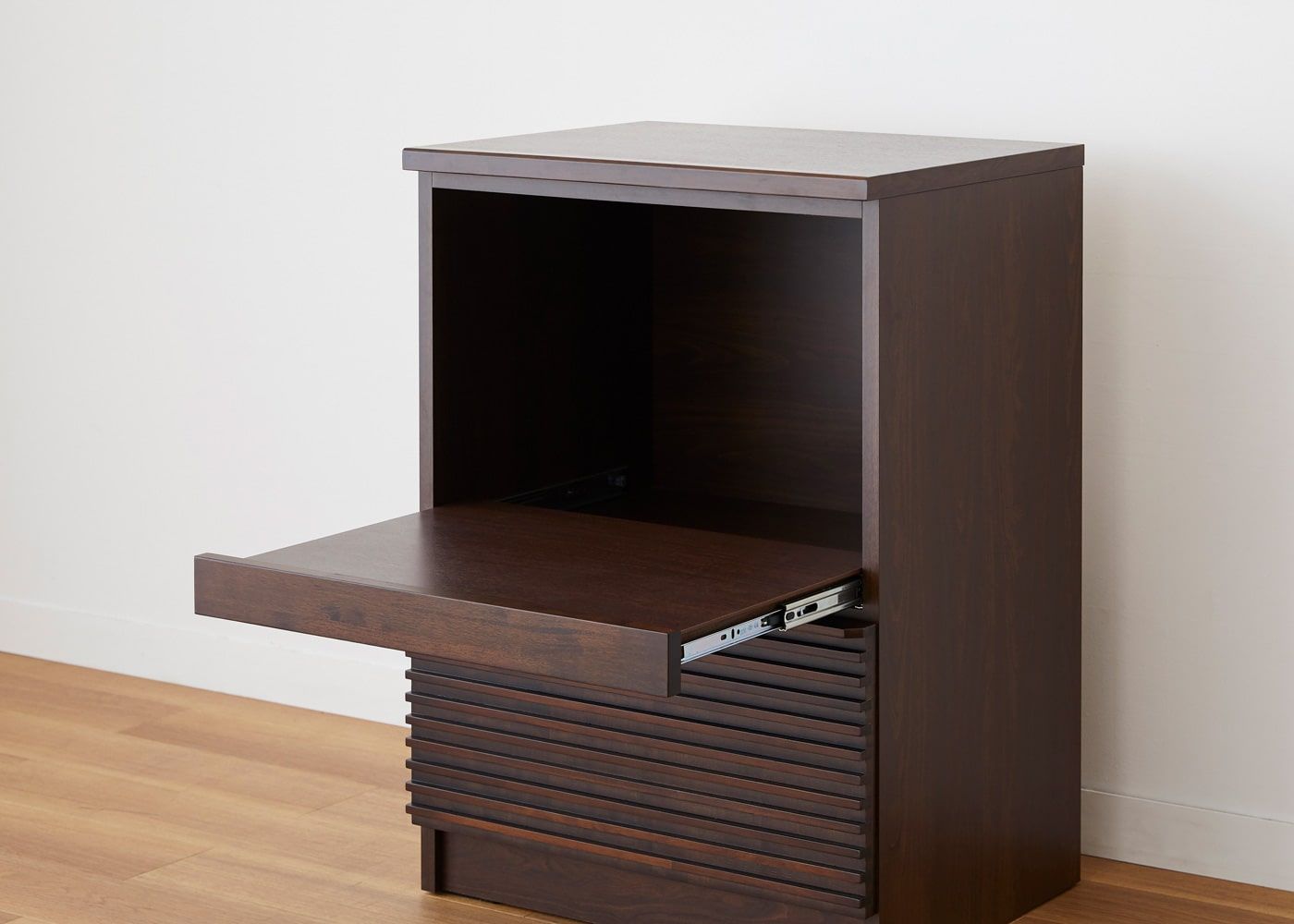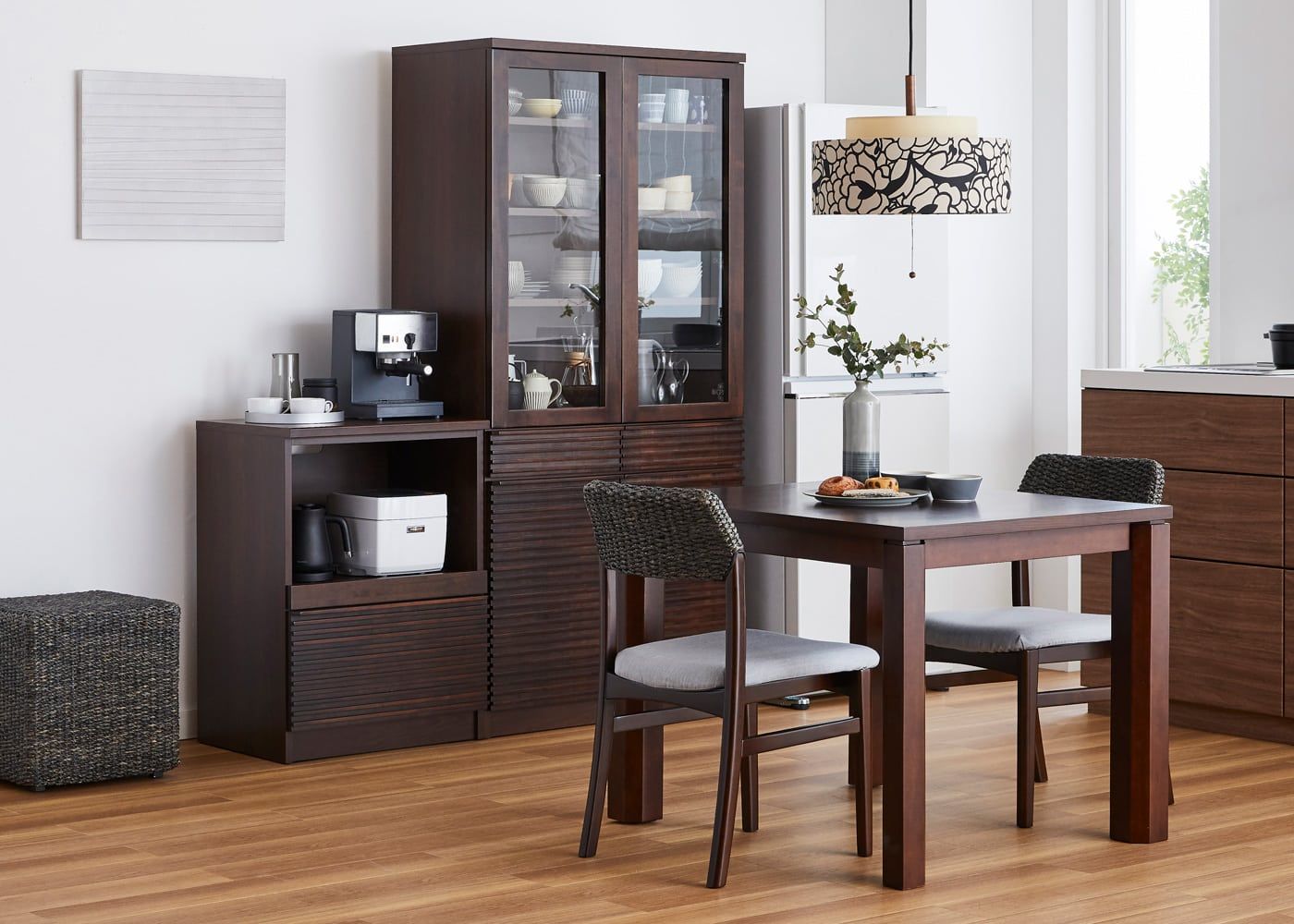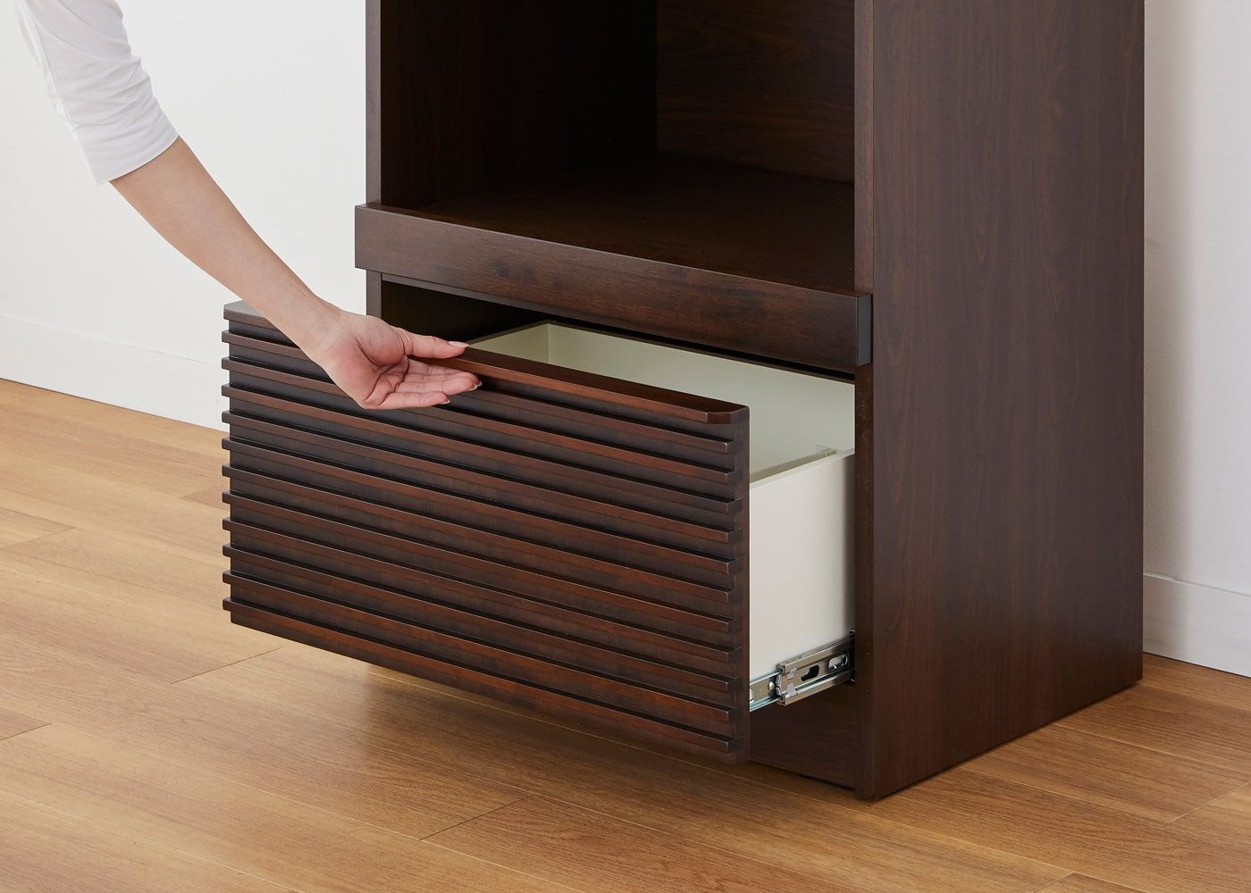 重厚感のあるダークブラウンと、無垢材を用いた水平ラインによって洗練感が漂います。コンパクトなサイズ感や収納性だけでは無く、デザイン性も求める方にお薦めです。