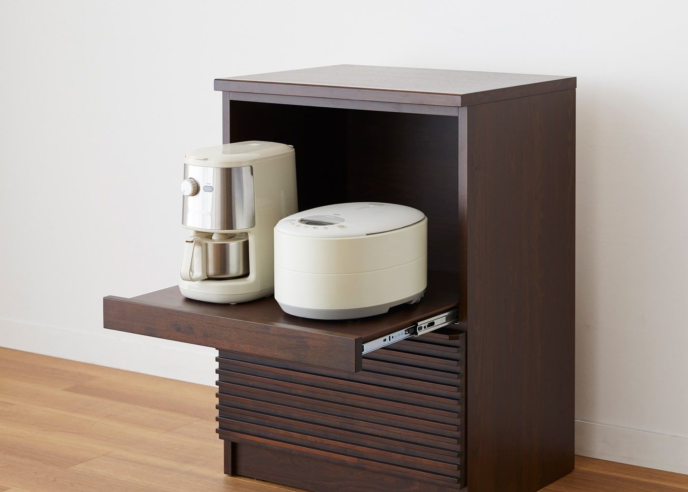 スライド収納スペースには、コーヒーメーカーや炊飯器などのキッチン家電を格納可能。スライド棚を引き出してお使い頂けるため熱や蒸気なども安心です。