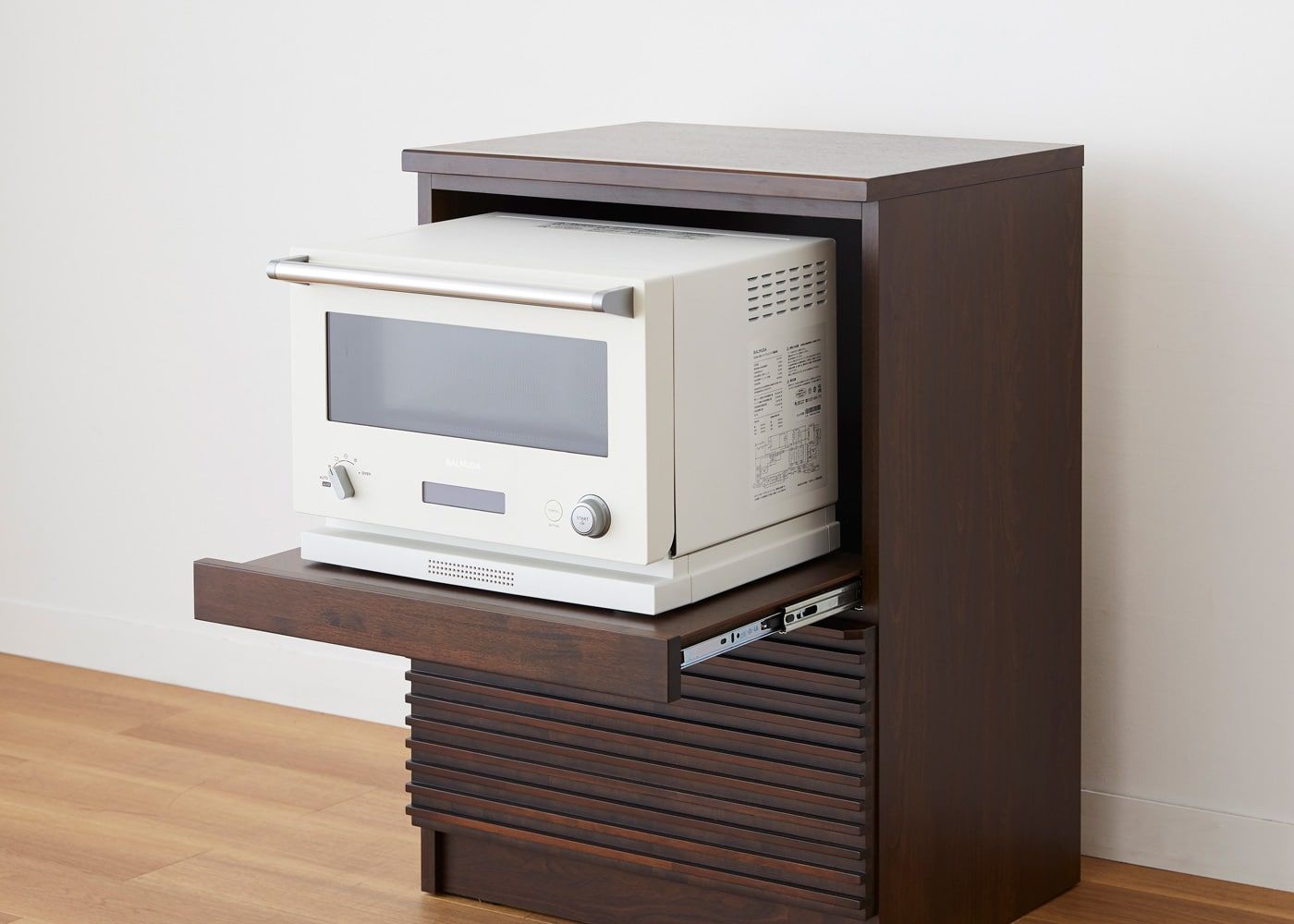コンパクトな電子レンジも格納可能。スライド棚で引き出せるため、レンジの清掃がしやすくなります。(写真の電子レンジ寸法は、幅450mm×奥行き412mm×高さ330mm)