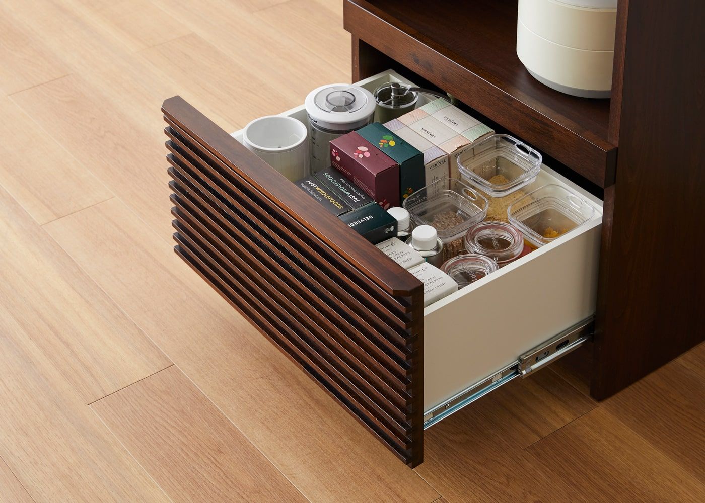 下段の引き出しは深さ240mmです。高さのある食料品や小さい調理家電なども収納できます。また、可動式の仕切り板は仕切り位置が自由に変えられるため、収納したいアイテムのサイズに合わせて収納スペースを作ることができます。(仕切り板2枚付属)