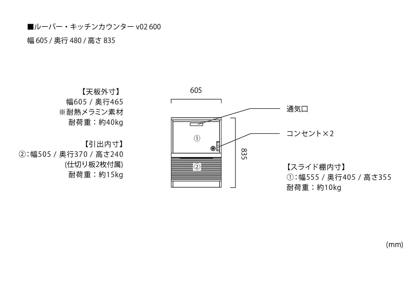 幅605 / 奥行480 / 高さ835 ※単位は mm