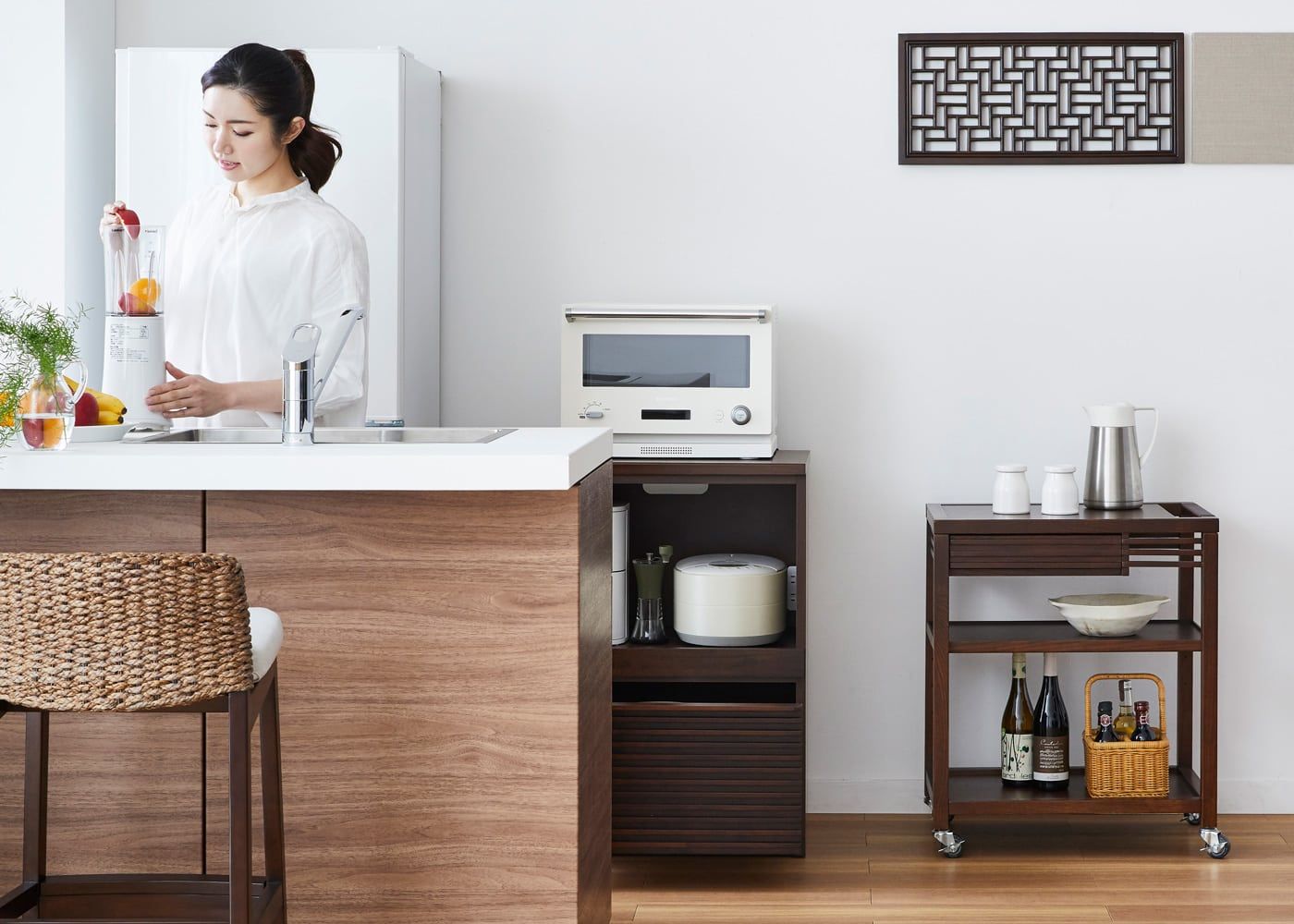 デザイン性に加えて、コンパクトながらも収納力や機能性を兼ね備えたキッチンカウンターです。毎日の暮らしに欠かせない料理の時間、キッチンで過ごす時間を楽しく過ごせます。(モデルは身長167cmの女性)