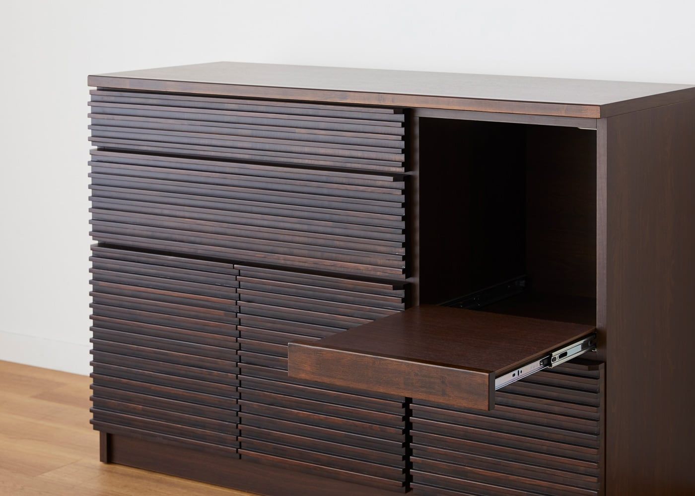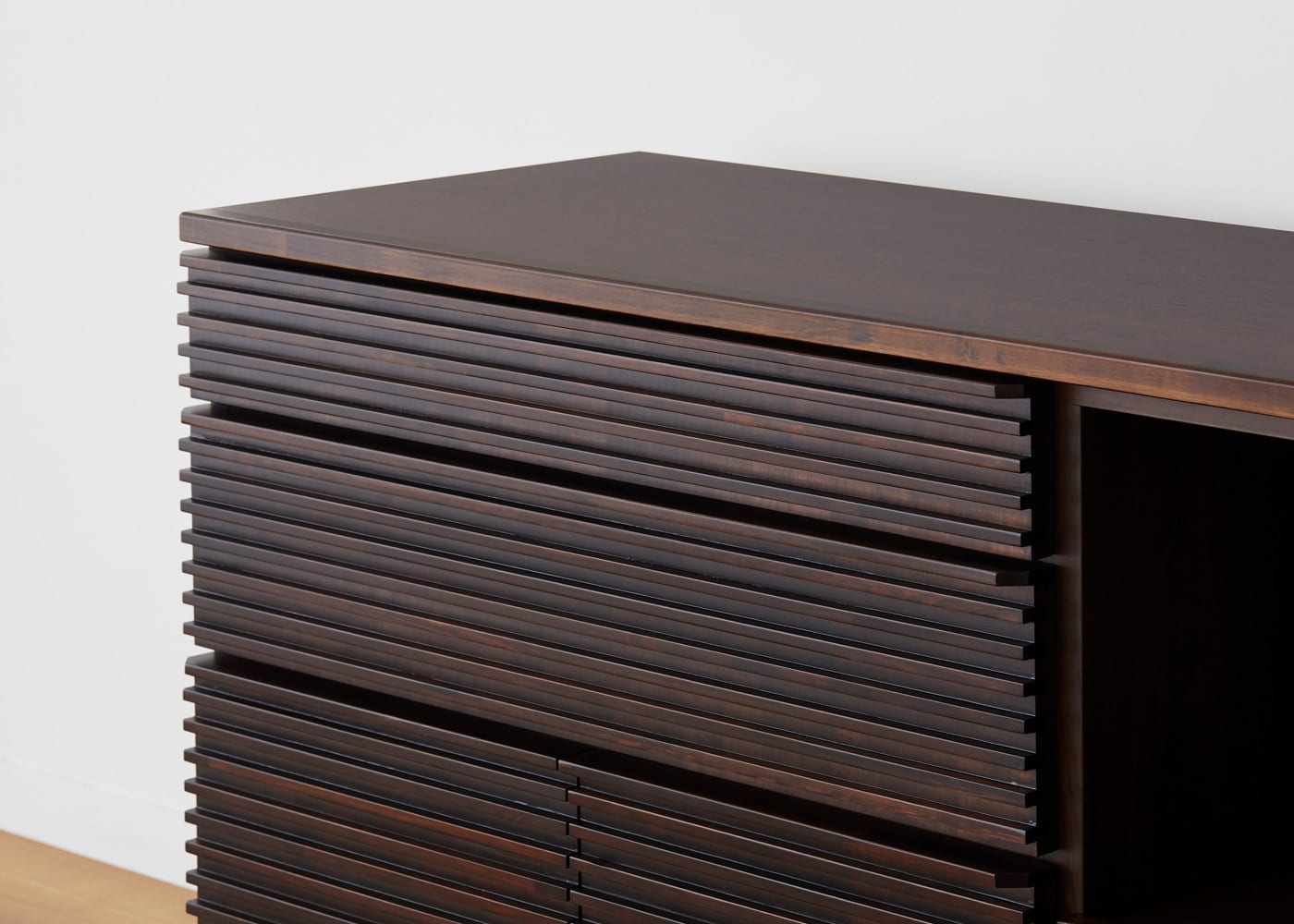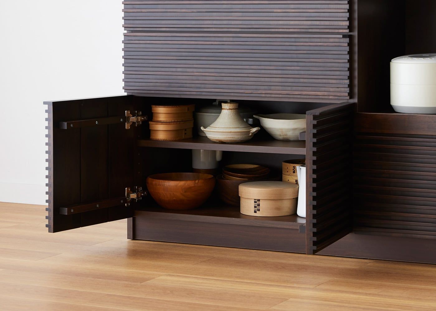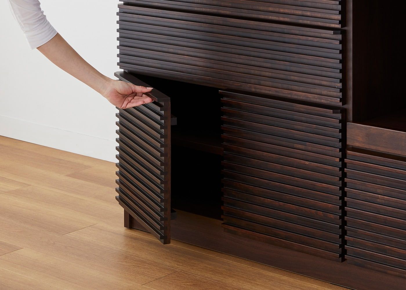 重厚感のあるダークブラウンと、無垢材を用いた水平ラインによって洗練感が漂います。収納力や機能性だけでは無く、デザイン性も求める方にお薦めです。