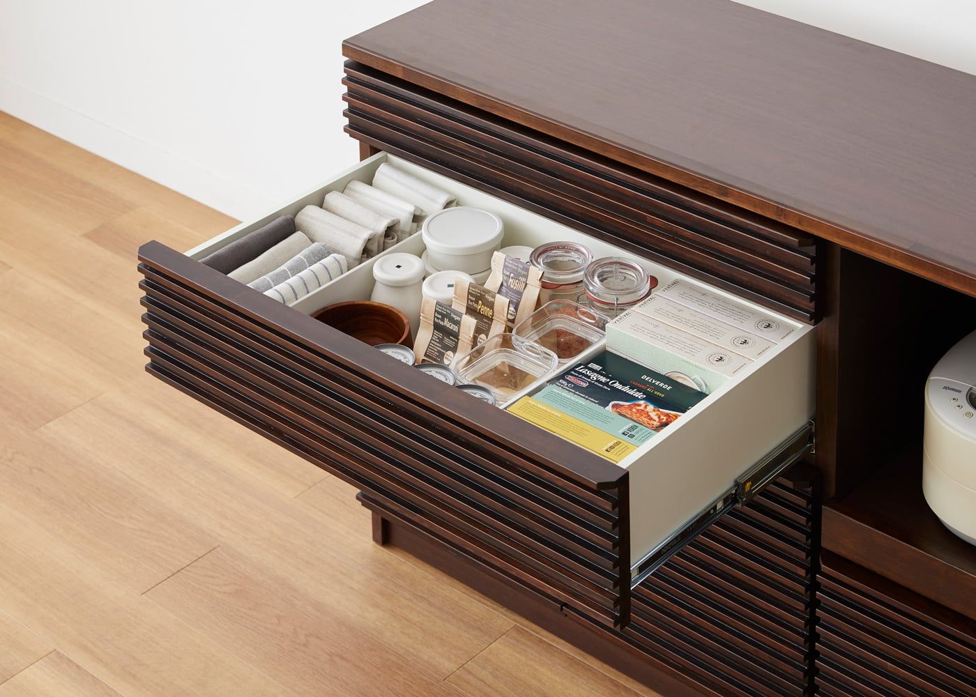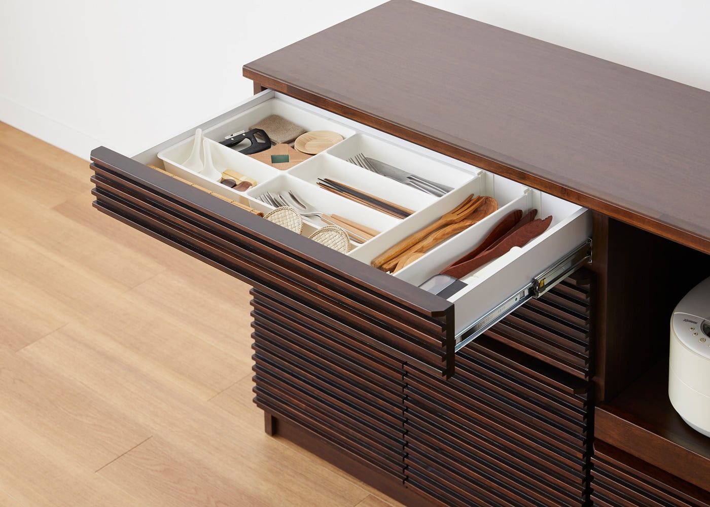 引き出しの1段目は深さ80mmです。カトラリーやコースター、箸置きなど細かいアイテムを収納できます。また、各引き出しには可動式の仕切り板を2枚ずつ付属しています。