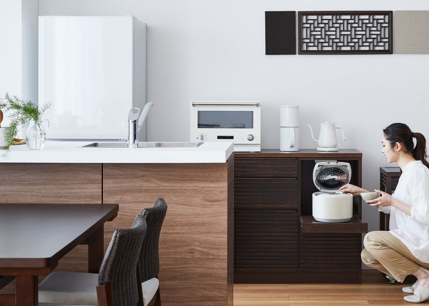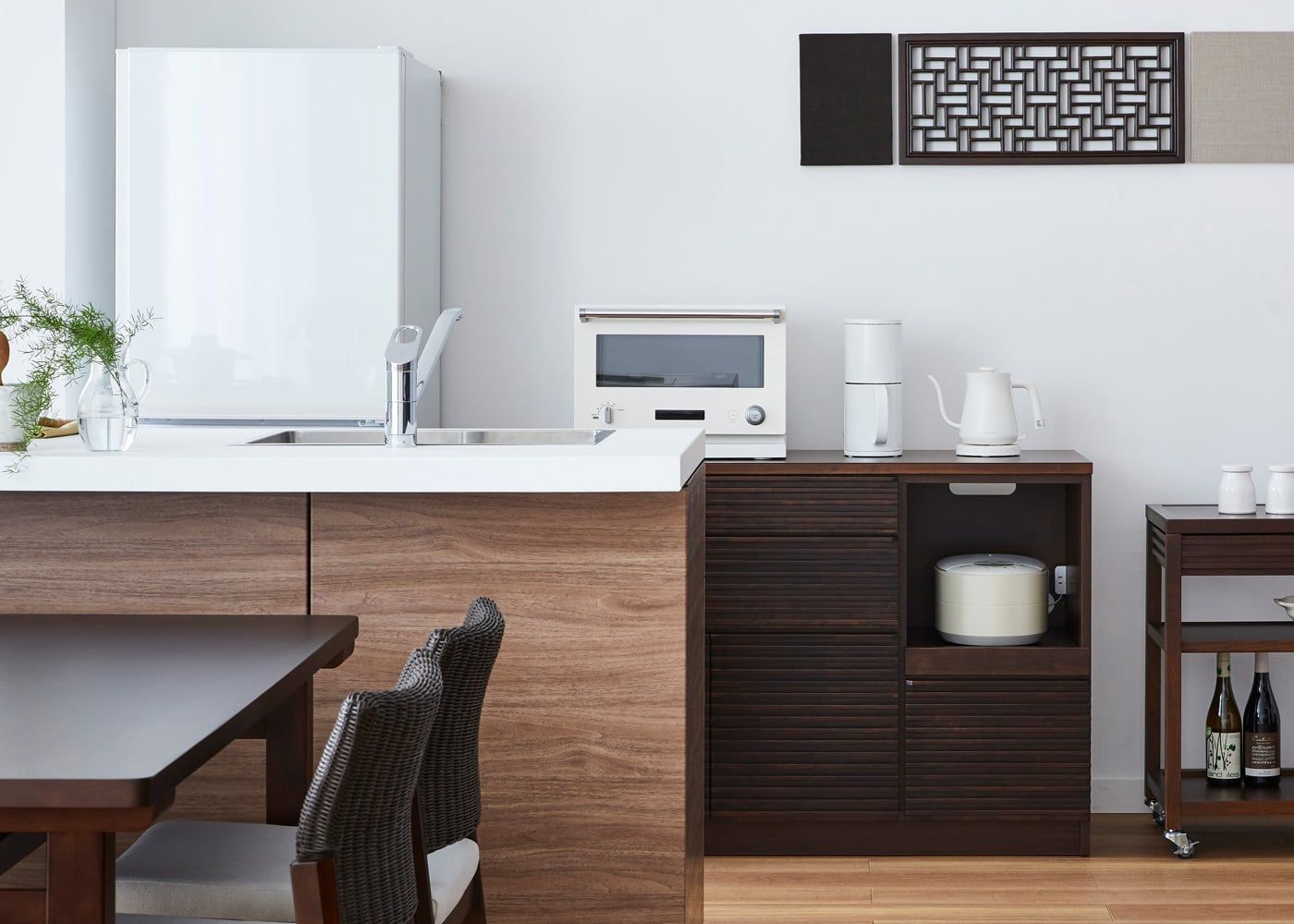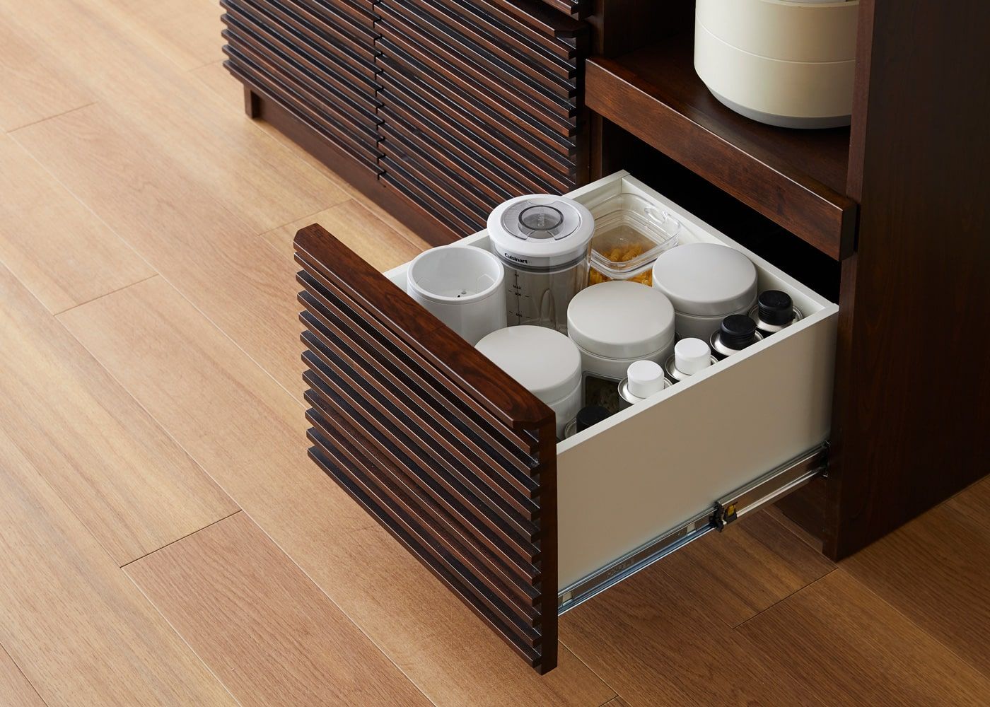 スライド収納スペースには、炊飯器やポットなどのキッチン家電を格納可能。スライド棚を引き出してお使い頂けるため熱や蒸気なども安心です。