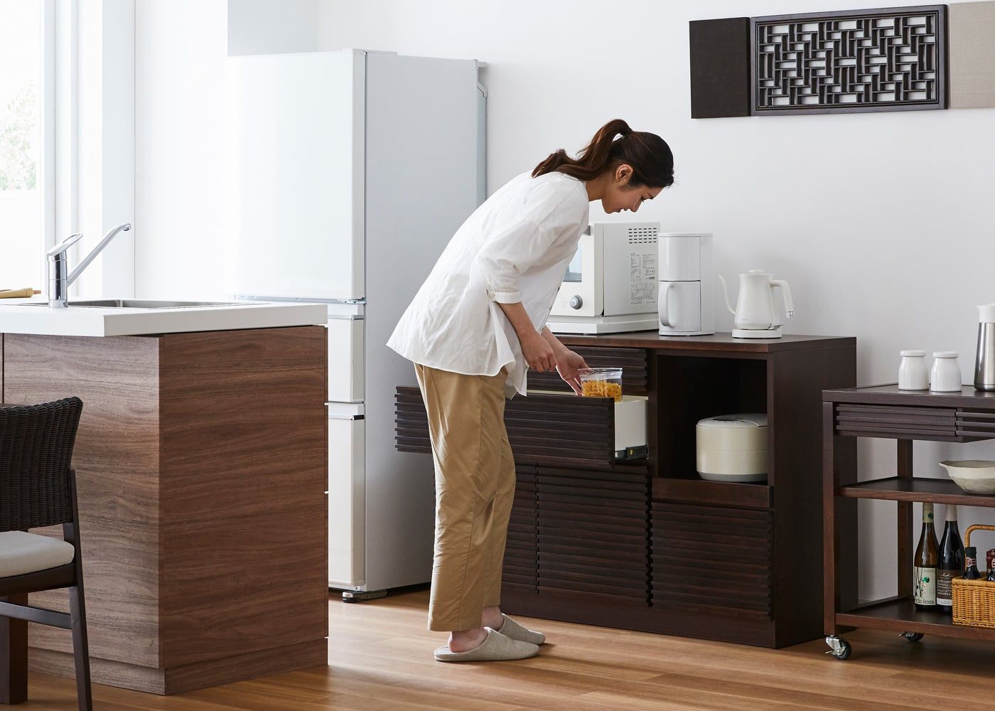 デザイン性に加えて、便利な収納力と機能性を併せ持ったキッチンカウンターです。毎日の暮らしに欠かせない料理の時間、キッチンで過ごす時間を楽しく過ごせます。(モデルは身長167cmの女性)