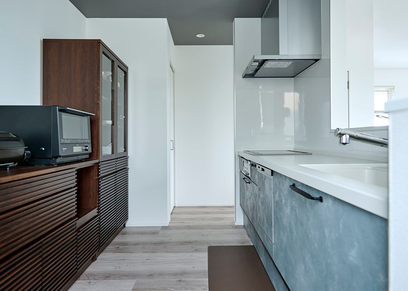 海が見える湘南の別荘ライフを叶えたお客様宅の実例。非日常感にこだわった部屋づくりで、キッチン内の収納家具もルーバーデザインで魅せるスペースを作り上げました。