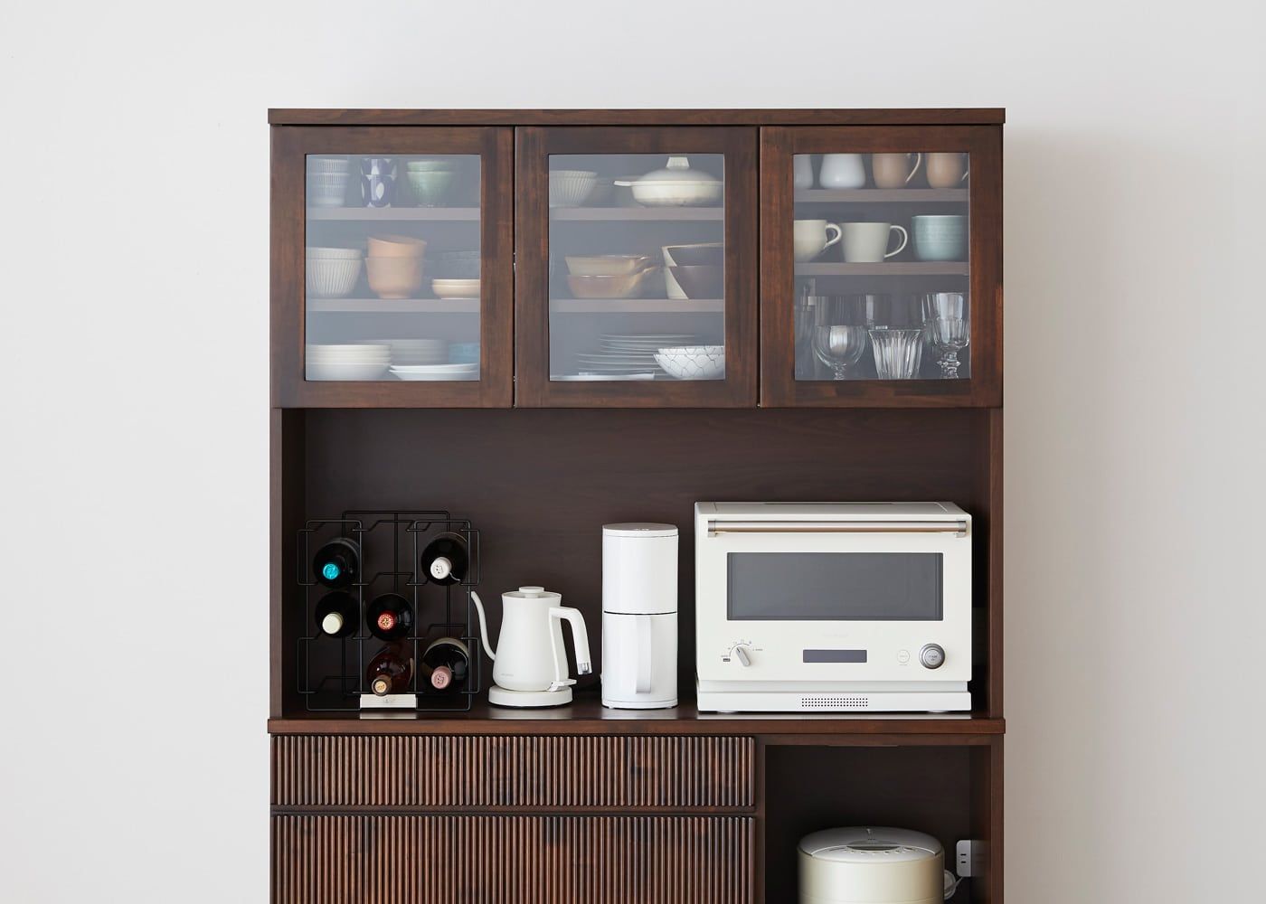 上段のオープン収納スペースは、電子レンジやコーヒーメーカー、ケトルなどのキッチン家電を数点並べて配置できます。
