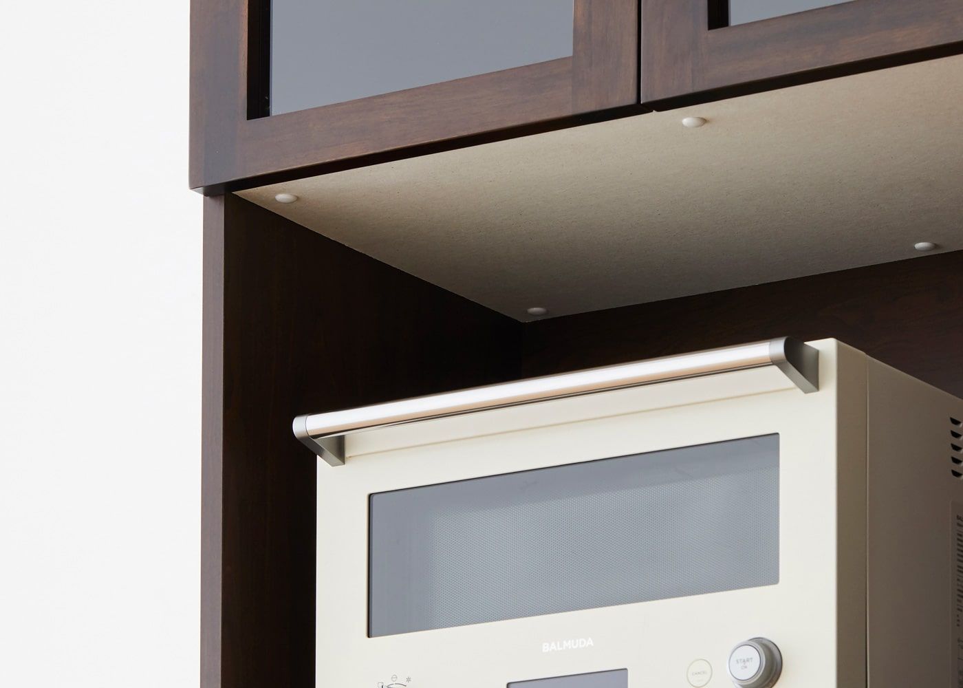 オープン収納スペースの底面は180度耐熱のメラミン仕様のため、レンジやポットなどの熱を持ちやすいキッチン家電も安心してお使い頂けます。