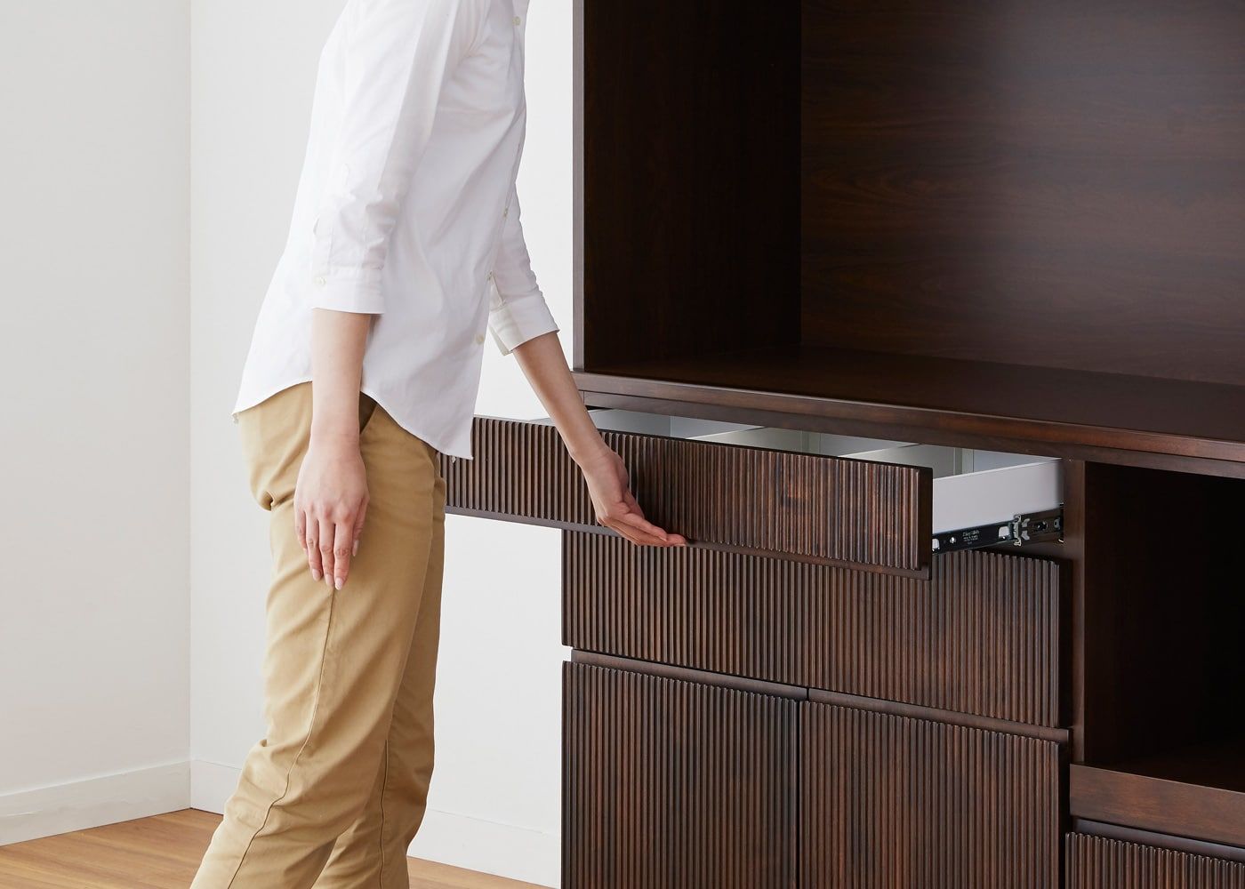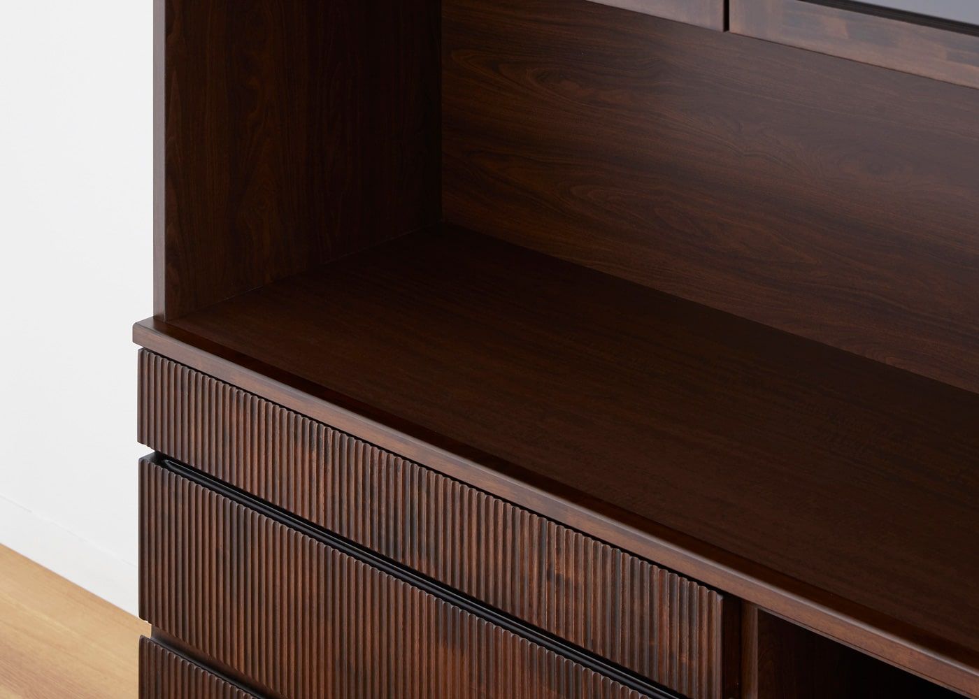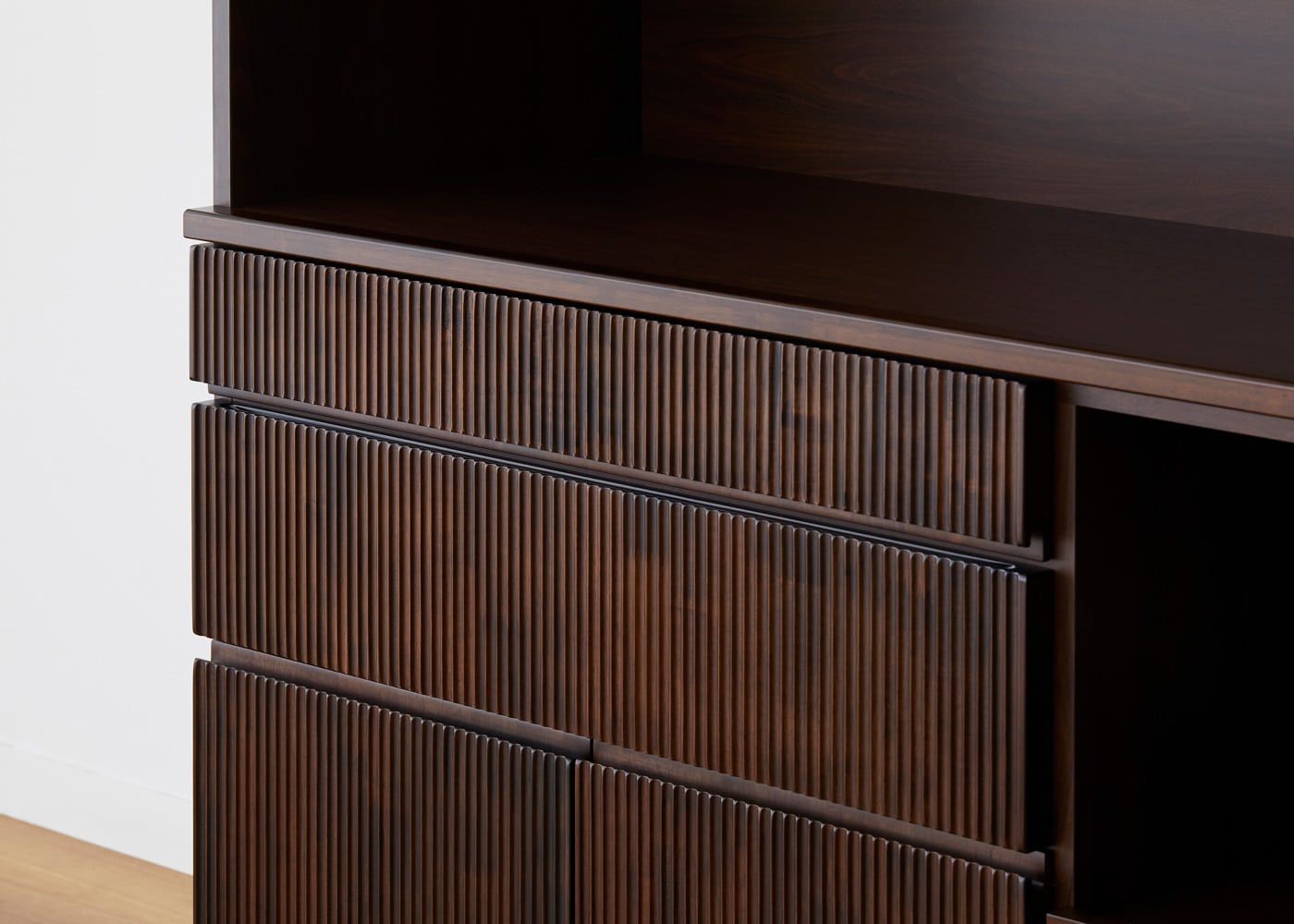 重厚感のあるダークブラウンと、無垢材に施した繊細な縦ラインによって高級感が漂います。収納力や機能性だけでは無く、デザイン性も求める方にお薦めです。