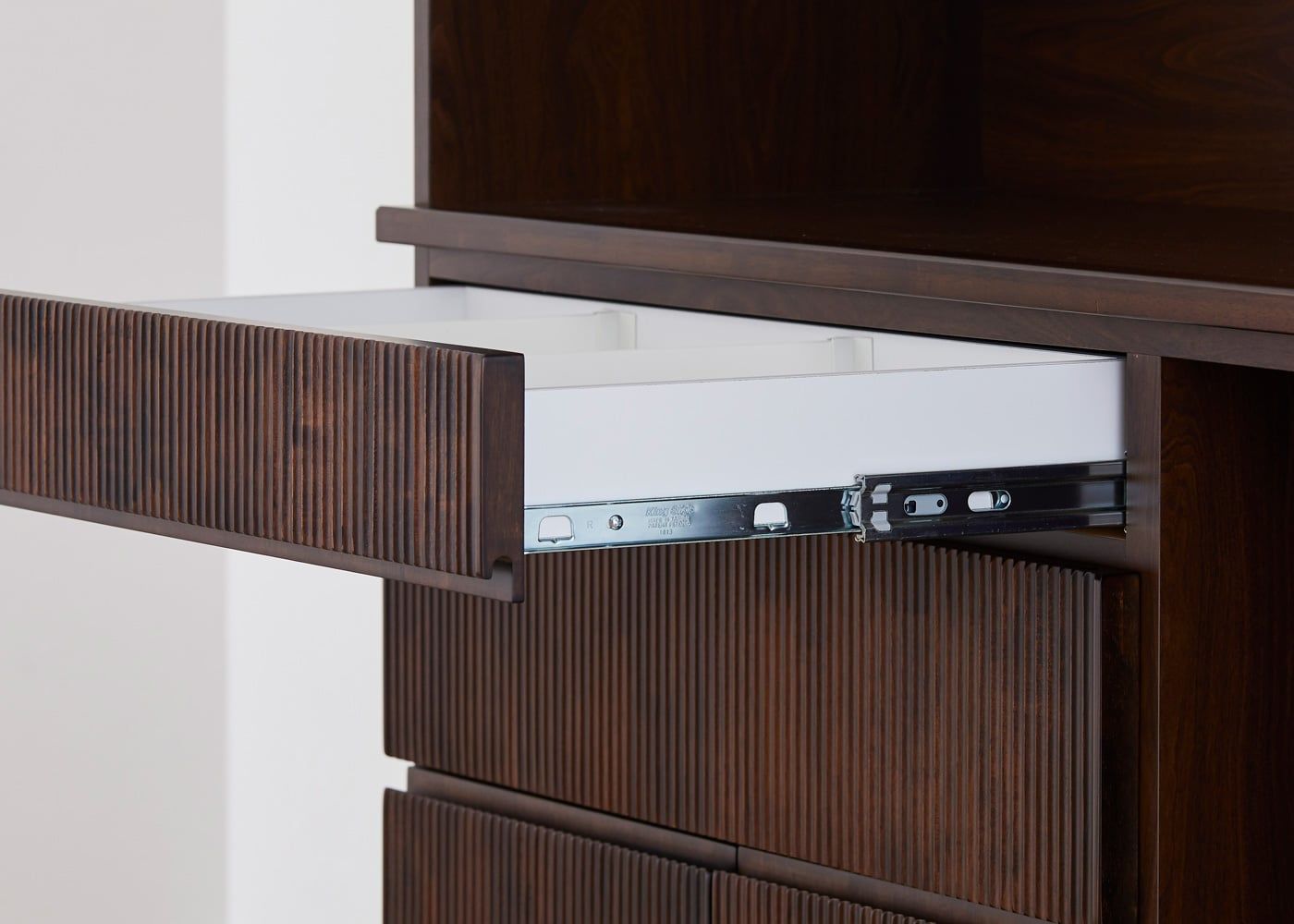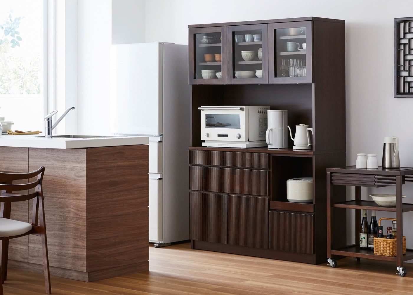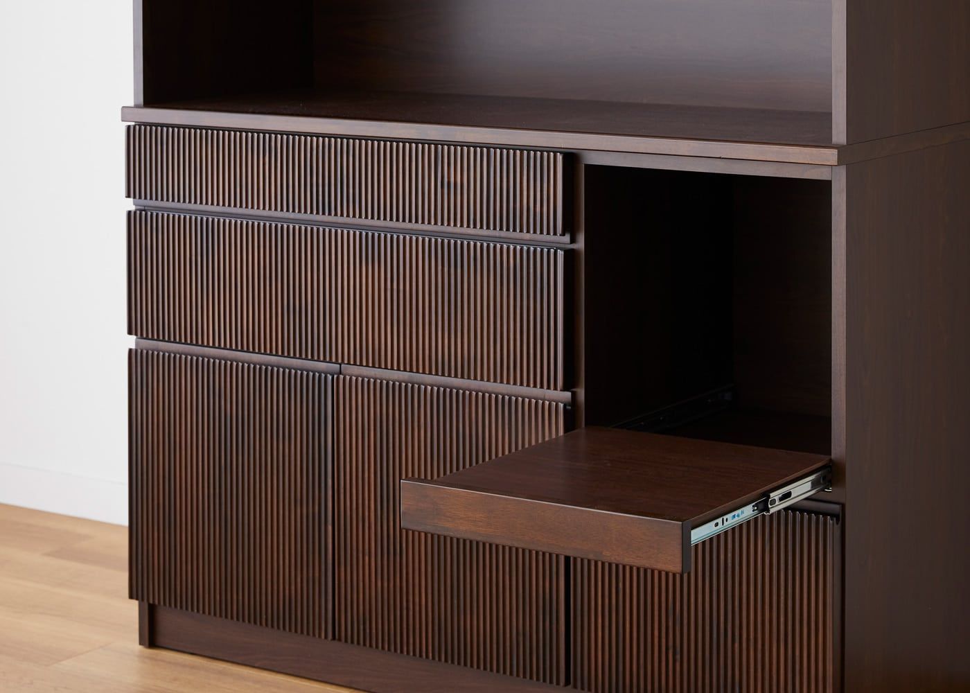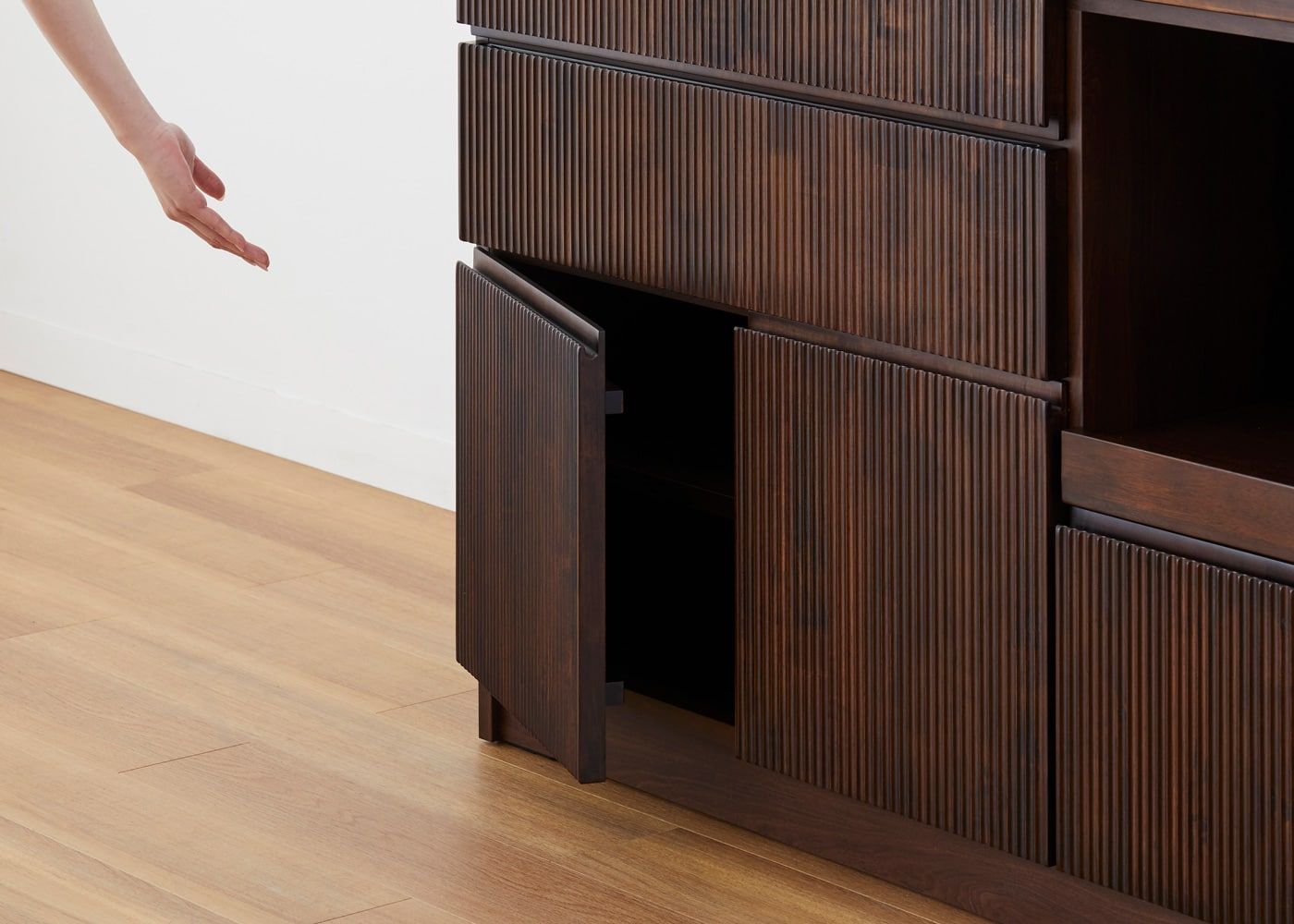 重厚感のあるダークブラウンと、無垢材に施した繊細な縦ラインによって高級感が漂います。収納力や機能性だけでは無く、デザイン性も求める方にお薦めです。