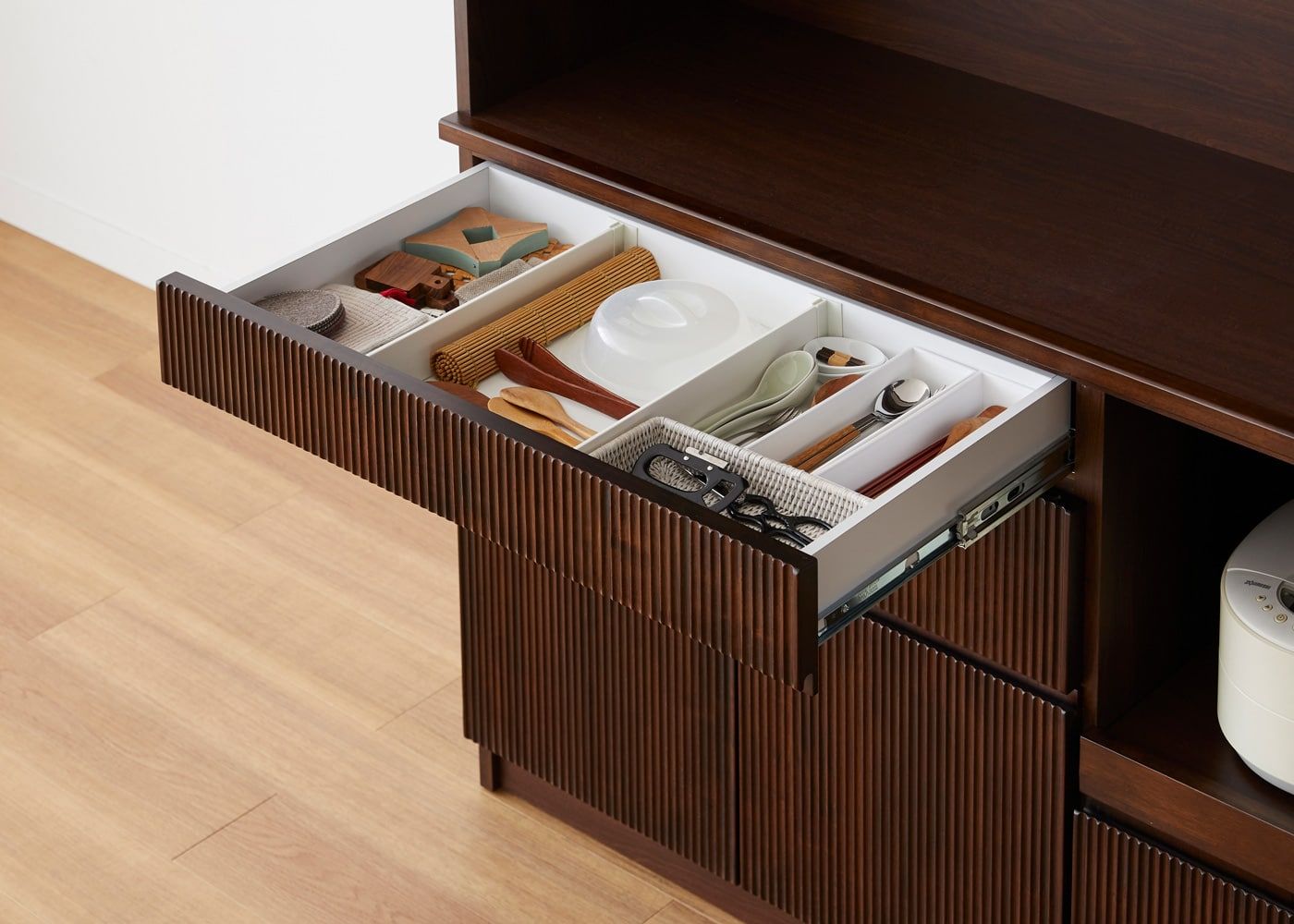 引き出しの1段目は深さ80mmです。カトラリーやコースター、箸置きなど細かいアイテムを収納できます。また、各引き出しには可動式の仕切り板を2枚ずつ付属しています。