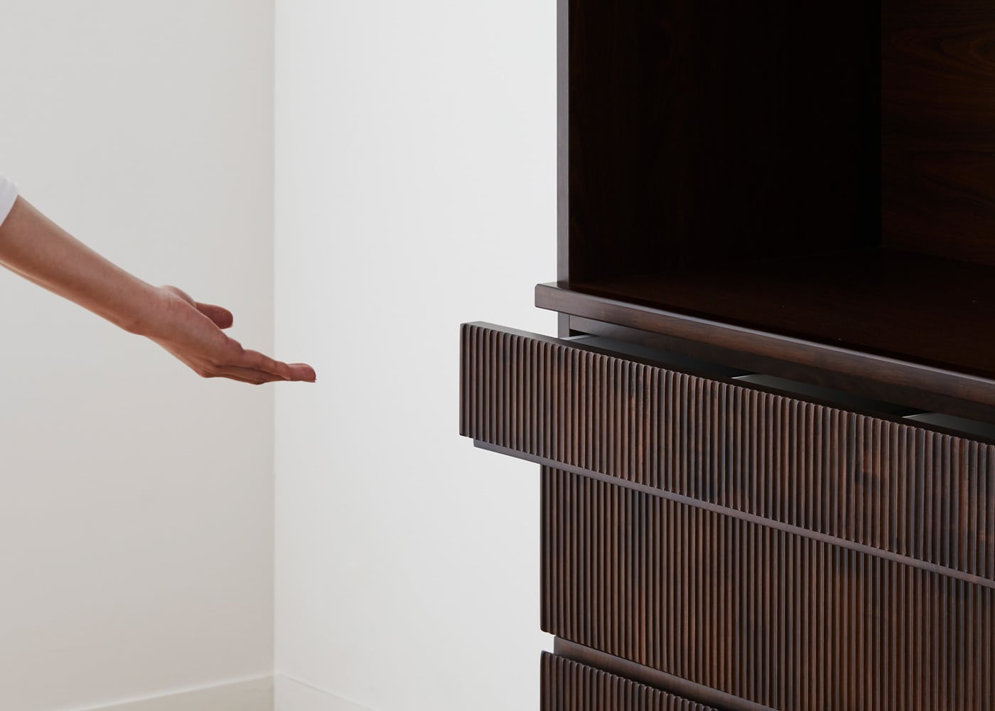 中段の引き出しは、下側の溝に指をかけて開くことができます。(モデルは身長167cmの女性)