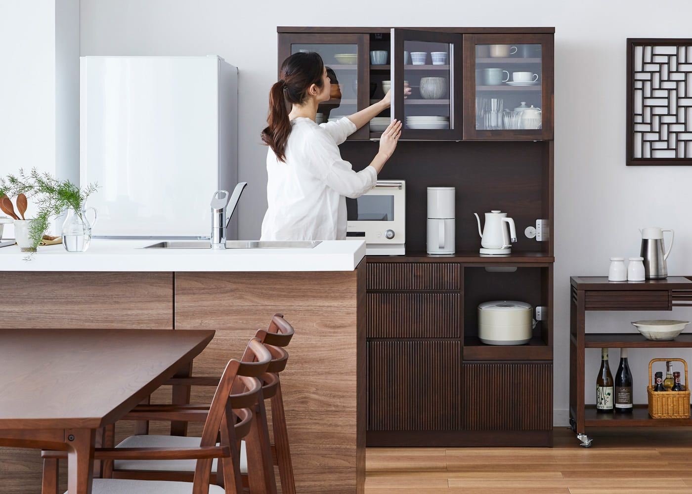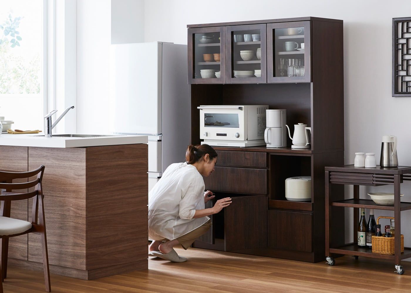 デザイン性に加えて、便利な収納力と機能性を併せ持ったキッチンボードです。毎日の暮らしに欠かせない料理の時間、キッチンで過ごす時間を楽しく過ごせます。(モデルは身長167cmの女性)