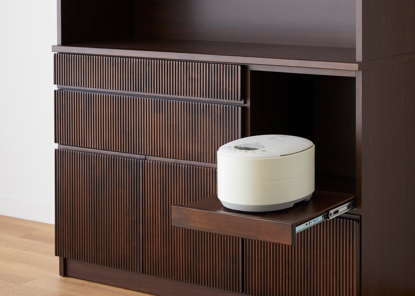 スライド収納スペースには、炊飯器やポットなどのキッチン家電を格納可能。スライド棚を引き出してお使い頂けるため熱や蒸気なども安心です。